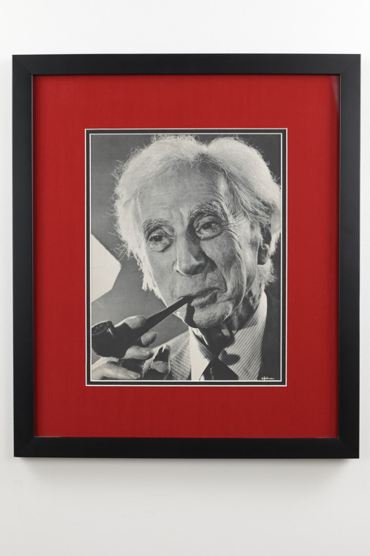 Framed pair of black and white portrait prints after photographs by renowned photographer Philippe Halsman. Includes portraits titled Bertrand Russell 1958 and Old Bearded Man, professionally framed with bold red matting.