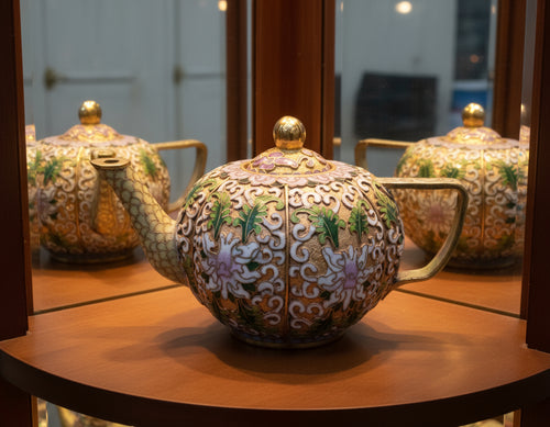 Vintage CloisonnΓ© Enamel Teapot β Floral Motif, Brass with Lilac, Green & Gold Enamel, 5β x 3β