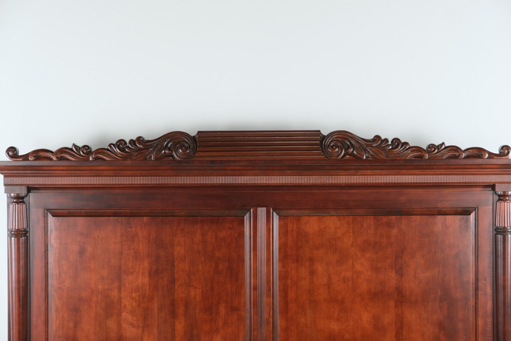 Make a grand statement in your bedroom with this stately king-size bed by Newport Cabinet Company, a respected fine furniture maker believed to be based in Durham, Ontario, Canada. Designed to complement their signature dresser and mirror sets, this piece showcases exceptional craftsmanship and timeless elegance.