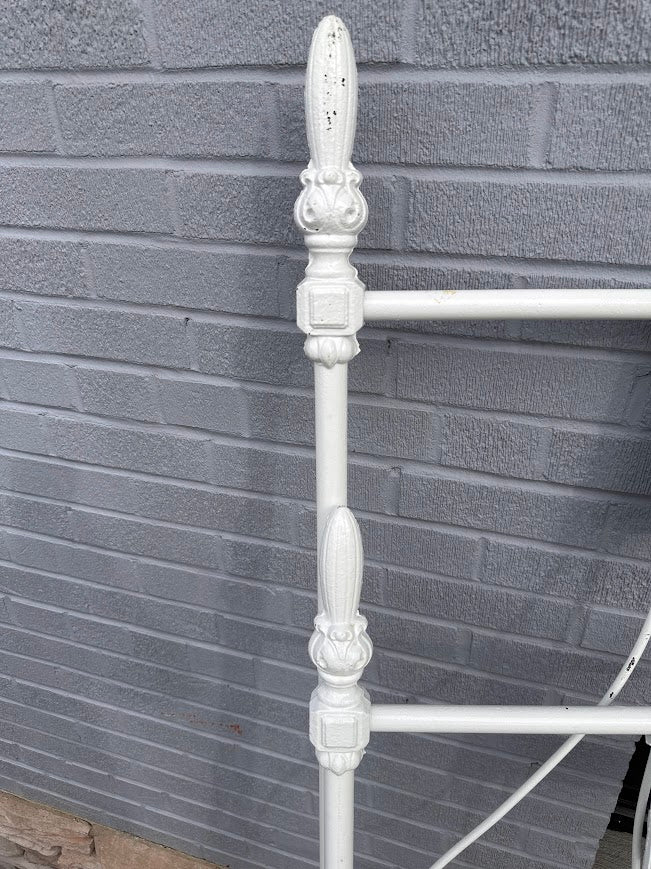 Constructed from solid cast and wrought iron, this bed showcases intricate floral and geometric motifs at each joint, paired with elegant finials and gentle arched supports. The white enamel finish enhances its classic silhouette and vintage appeal. A true example of early 20th-century craftsmanship, this piece offers both decorative beauty and reliable strength.