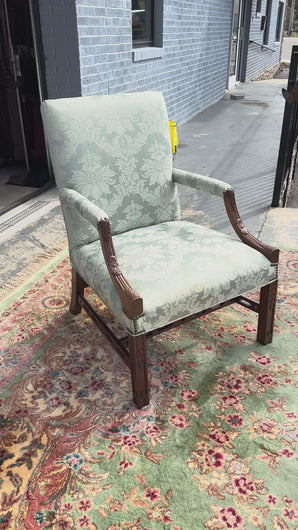 A refined example of Chippendale Revival craftsmanship, this elegant armchair combines timeless English design with luxurious comfort. The solid wood frame is beautifully hand-carved with acanthus leaf and floral motifs, while the soft green damask upholstery lends a graceful, understated presence. With its stately form and gentle seat, it’s a distinguished piece that balances sophistication and ease.