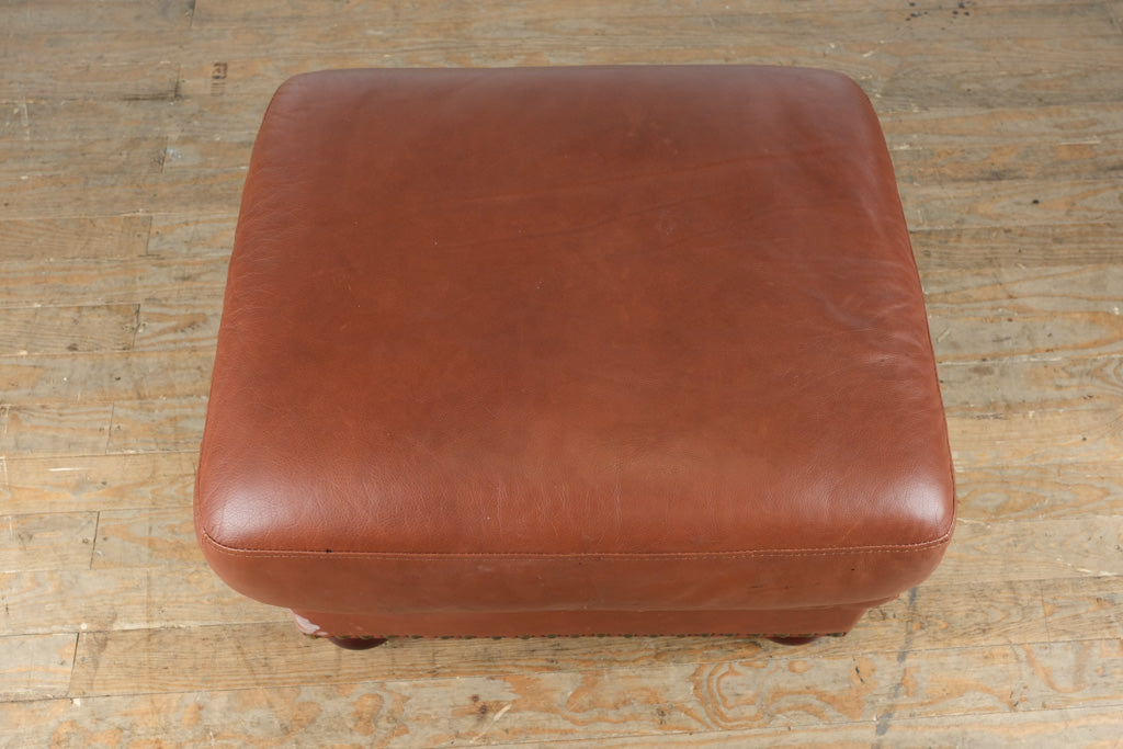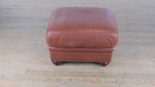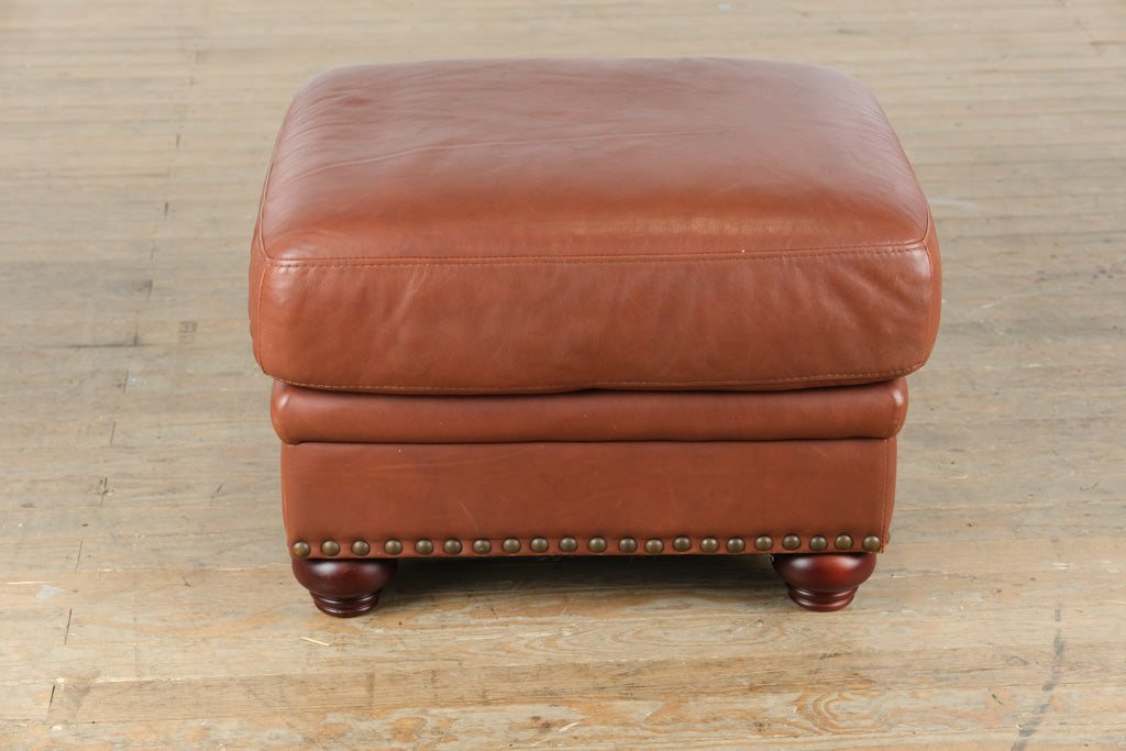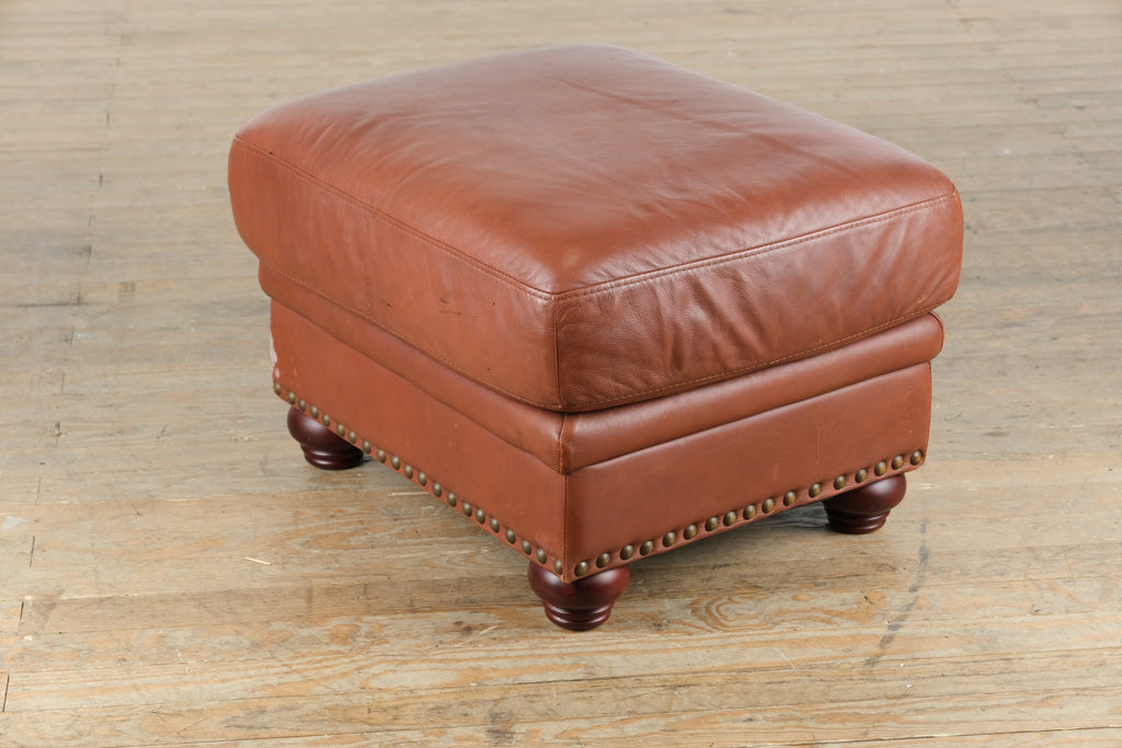 Material: Genuine brown leather upholstery with brass nailhead accents and turned wooden feet