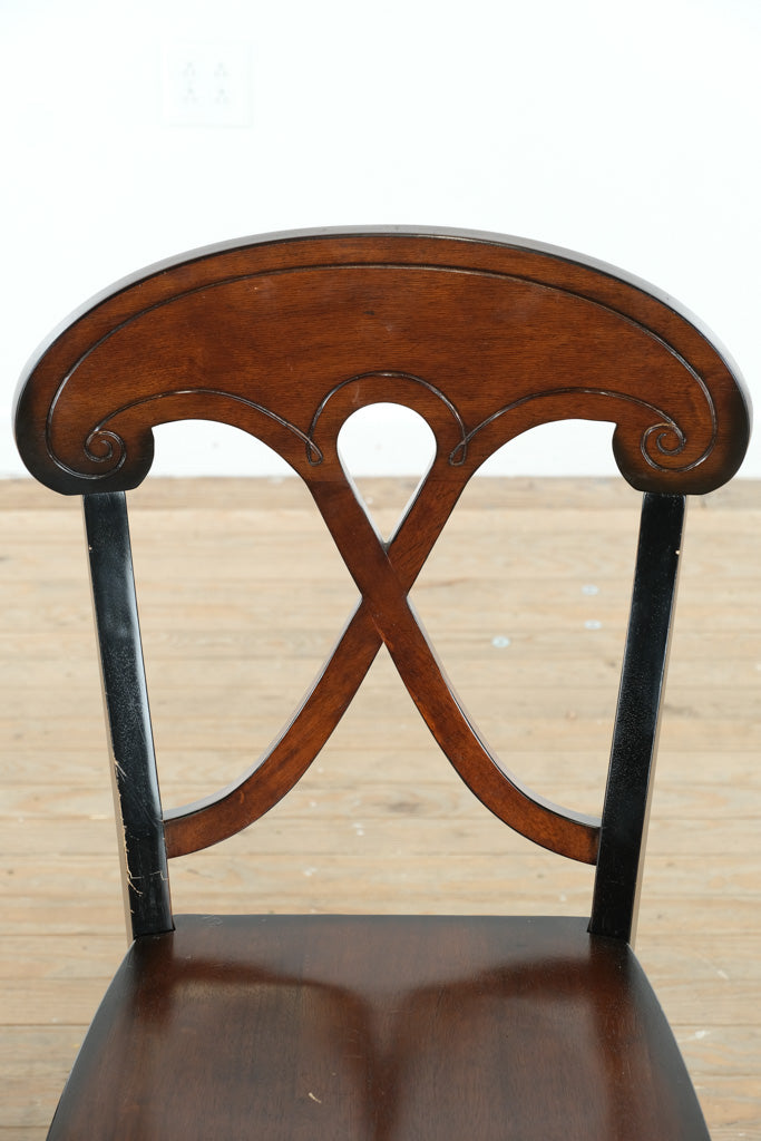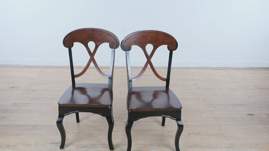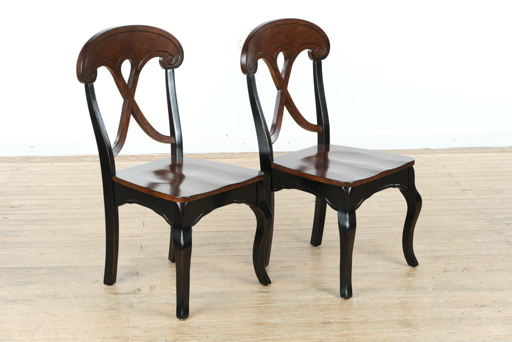 This pair of Pier 1 Imports Marchella dining chairs features an elegant two-tone design with warm brown seats and backs accented by black frames and legs. The carved scroll-top backs and curved cabriole-style front legs bring a refined traditional look, while the solid wood construction ensures long-lasting strength.
