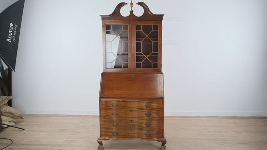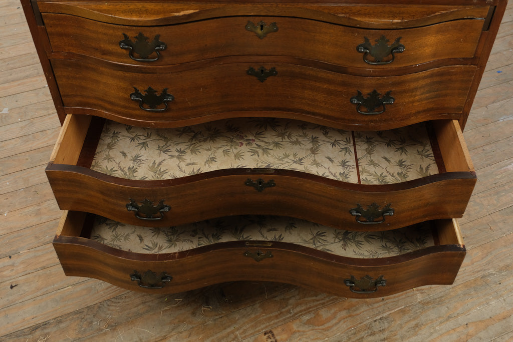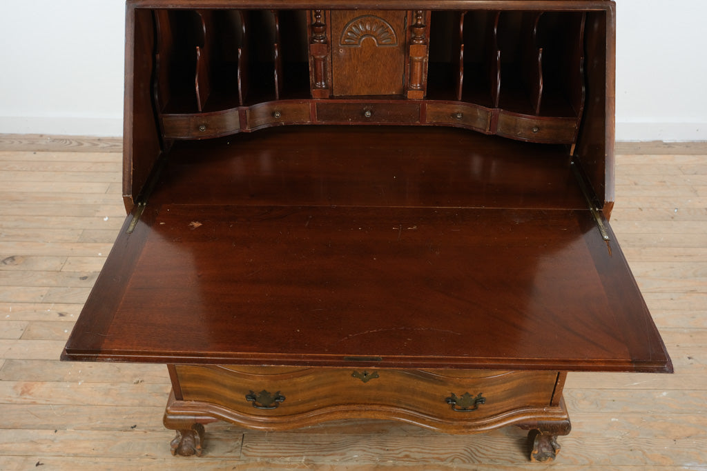 Expertly crafted from solid wood, this piece showcases the classic ball and claw feet, serpentine drawer fronts, and original brass hardware typical of the Governor Winthrop style. The drop-front writing surface opens to reveal multiple cubbies and small drawers, including a central fan-carved motif that adds character and dimension. The dovetailed drawers slide smoothly, reflecting the care and precision of traditional joinery.