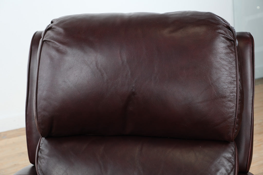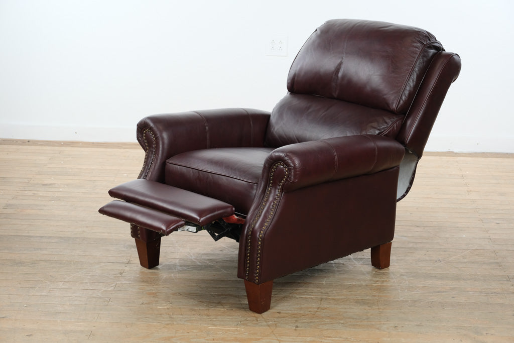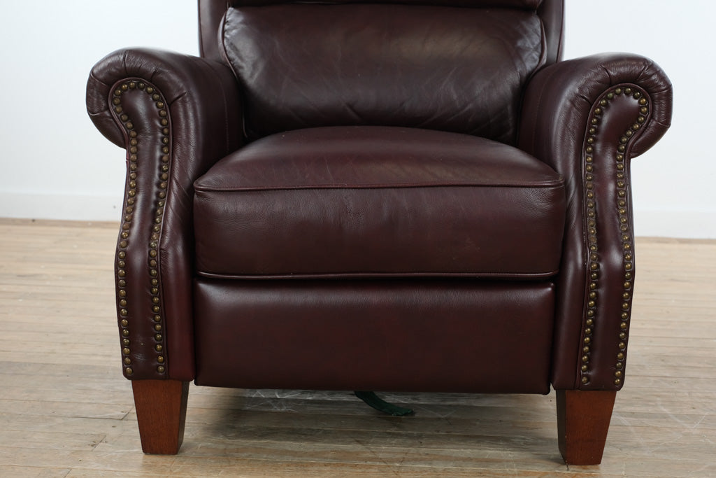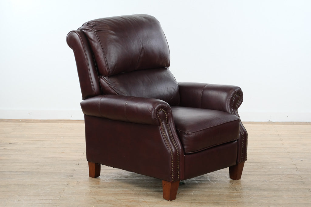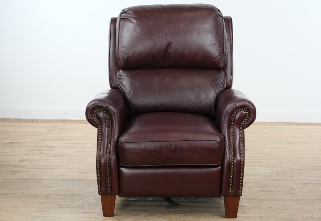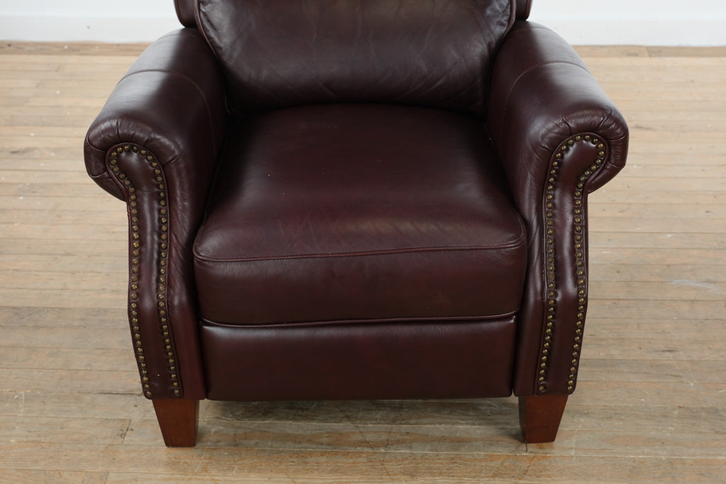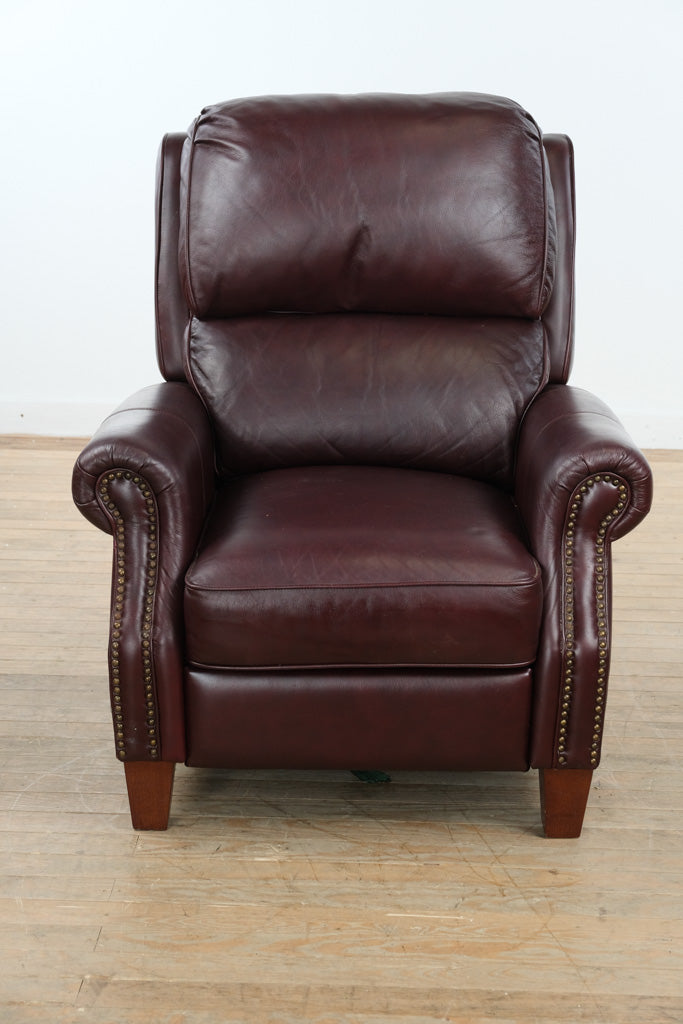 Elegant and richly toned, this cabernet leather recliner offers the perfect blend of sophistication and relaxation. Upholstered in smooth, full-bodied leather with a deep wine hue, it showcases classic rolled arms, plush cushioning, and traditional nailhead trim for a timeless aesthetic. Both beautiful and functional, this recliner invites you to sit back, put your feet up, and unwind in refined comfort.