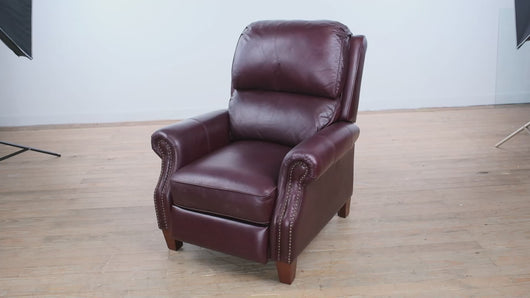 The cabernet leather hue lends this recliner a rich, inviting character that fits seamlessly into classic, transitional, or rustic interiors. Ideal for a study, living room, or reading nook, it pairs beautifully with wood furnishings and warm tones. The combination of supple leather, nailhead trim, and plush support makes it a standout piece for both comfort and style.