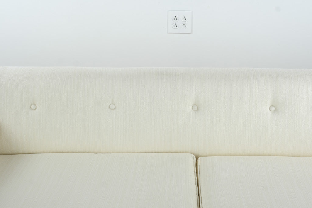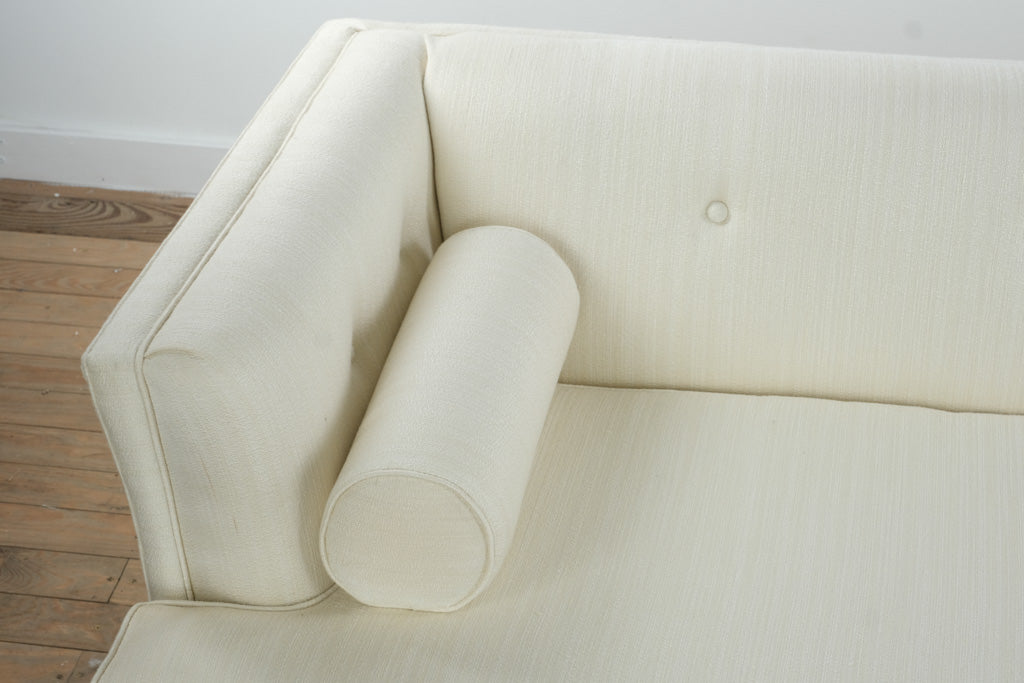 Expertly constructed with a solid hardwood frame, this sofa features high-quality ivory upholstery that exudes understated luxury. The tailored skirt and subtle button tufting highlight its mid-century design heritage, while the two cylindrical bolster pillows add a sculptural touch. The newly replaced foam ensures long-lasting comfort and refreshed support.