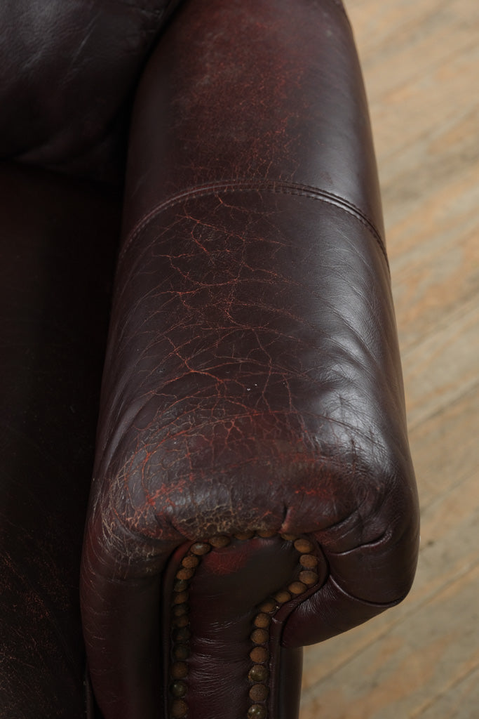 Expertly crafted with genuine leather on the seat, arms, and backrest, complemented by matching vinyl along the sides and back for lasting strength. The deep merlot hue showcases a soft sheen and natural patina, highlighted by brass nailhead detailing and solid wood legs for a sturdy, refined finish.