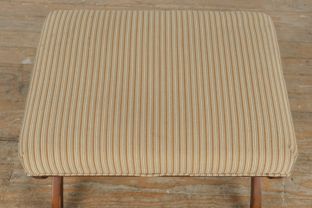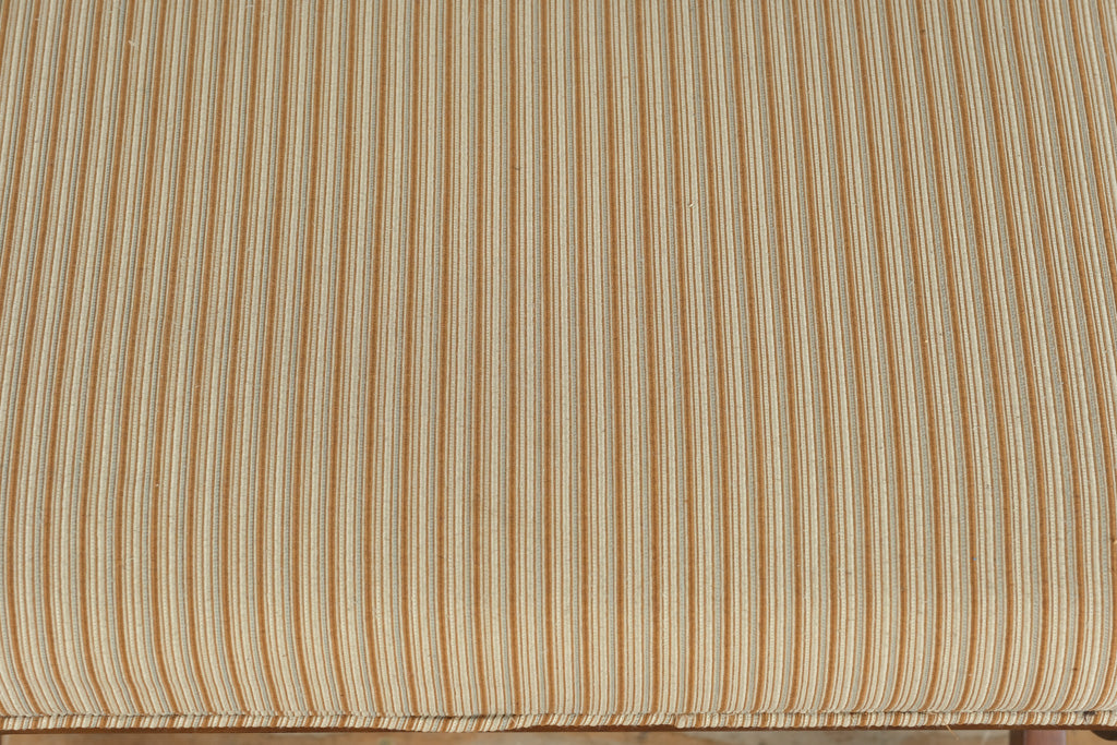 Expertly crafted with a solid wood frame and upholstered in a finely woven striped fabric in soft beige and taupe tones. The curved legs add sculptural balance and a touch of mid-century elegance, while the cushioned seat provides comfort and refinement.