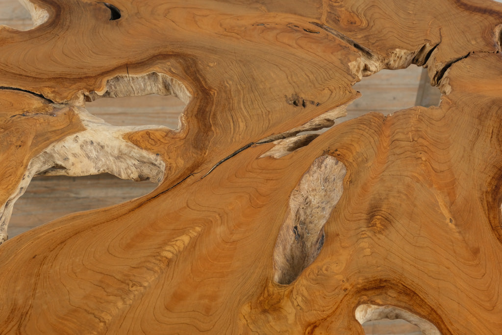 Each natural void and curve in the wood has been preserved to highlight its raw beauty, giving this piece an artistic, one-of-a-kind presence that makes it equally at home as a dining table, executive desk, or statement conference table.