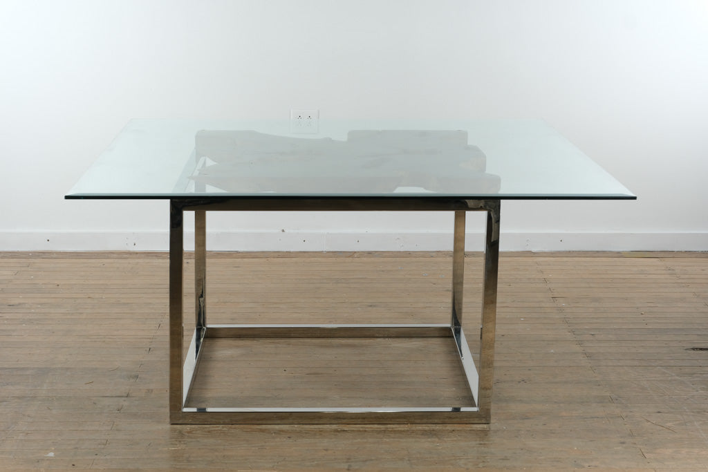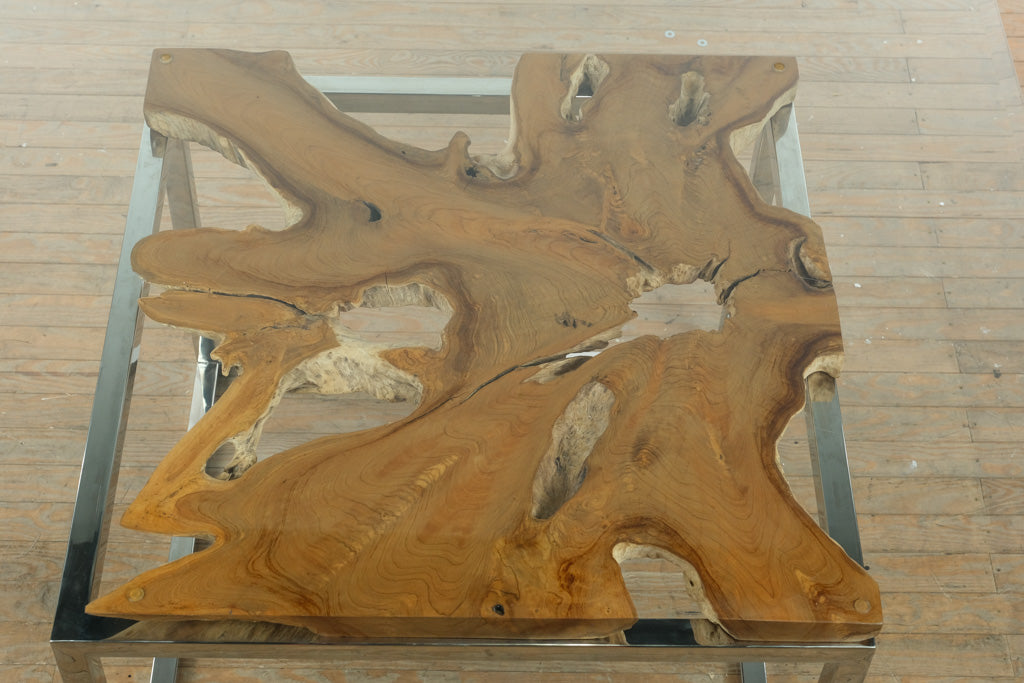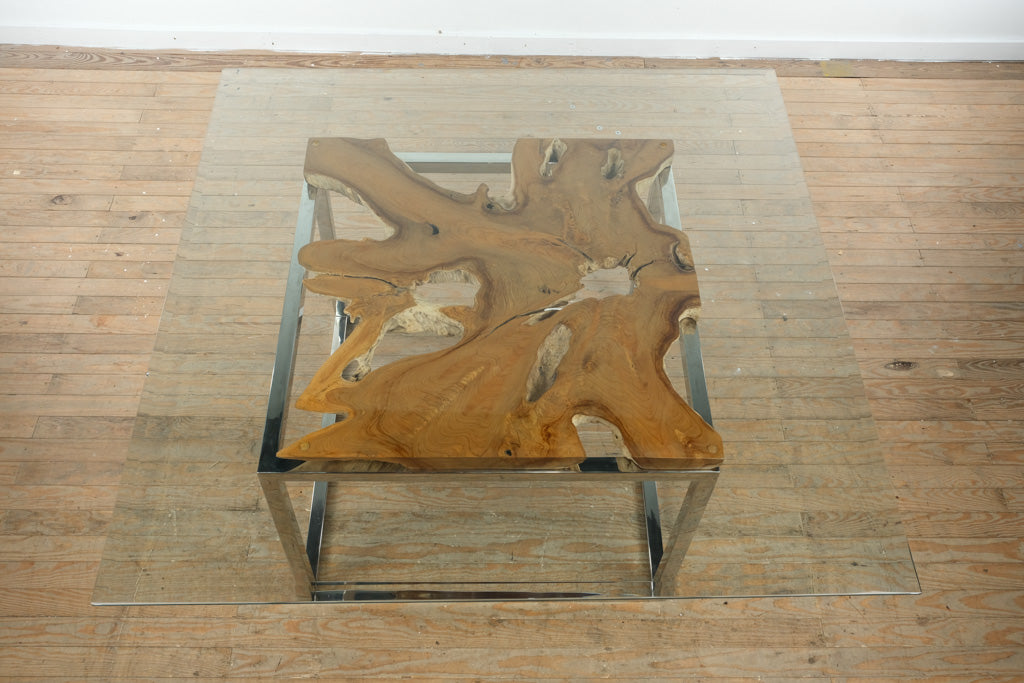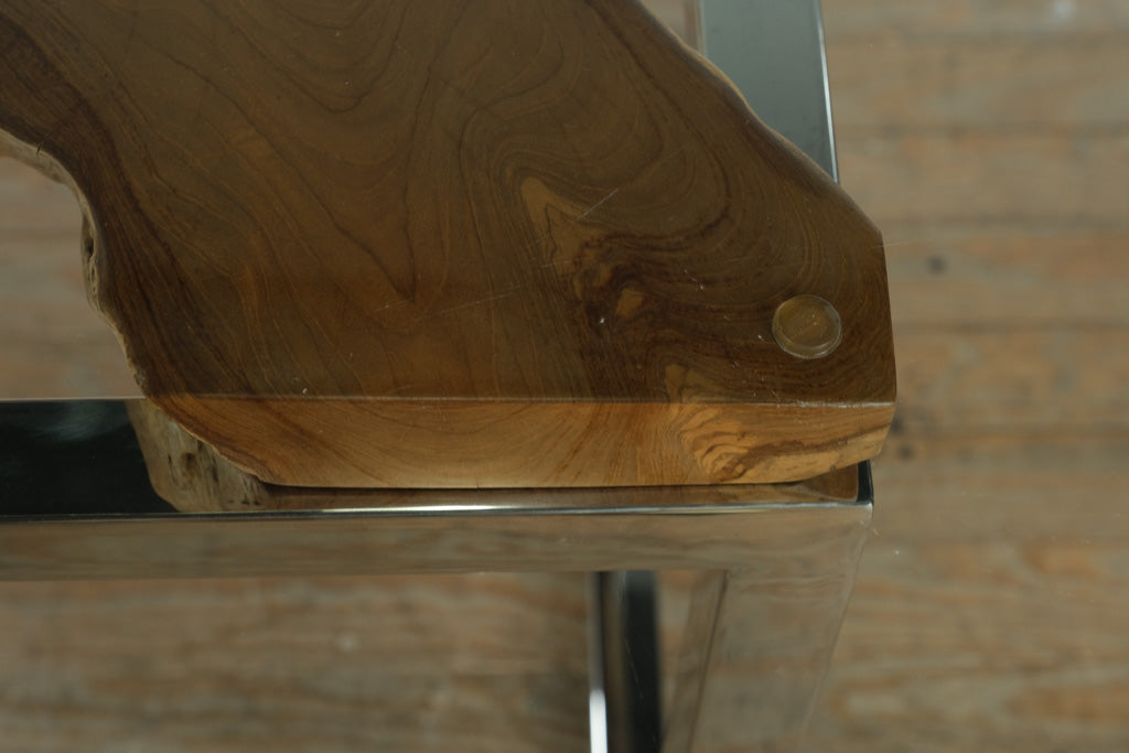 Live Edge Teak and Chrome Dining Table with Glass Top
