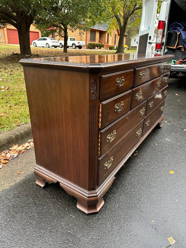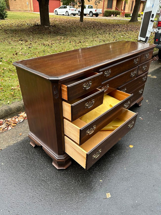 A striking example of classic American craftsmanship, this Ethan Allen Georgian Court dresser combines stately presence with enduring quality. Finished in a rich mahogany tone, it embodies refined traditional design with its brass hardware, elegant bracket feet, and balanced nine-drawer layout — a perfect harmony of function and timeless form.