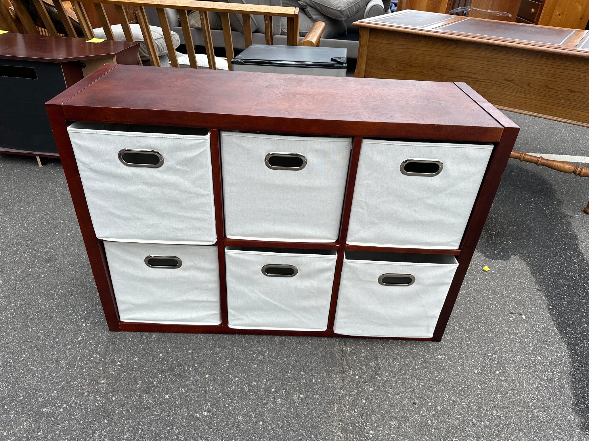 A sleek and functional storage solution, this six-cube organizer blends warm wood tones with soft neutral fabric bins for a timeless, versatile appeal. Perfectly sized for a playroom, living space, or office, it offers both practical organization and a clean, modern aesthetic.