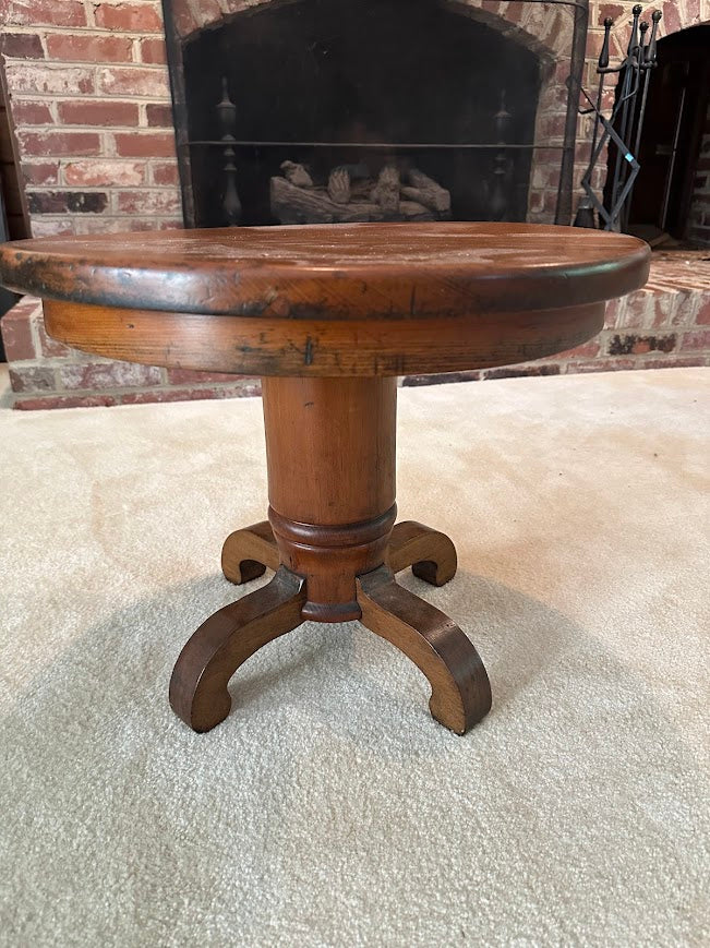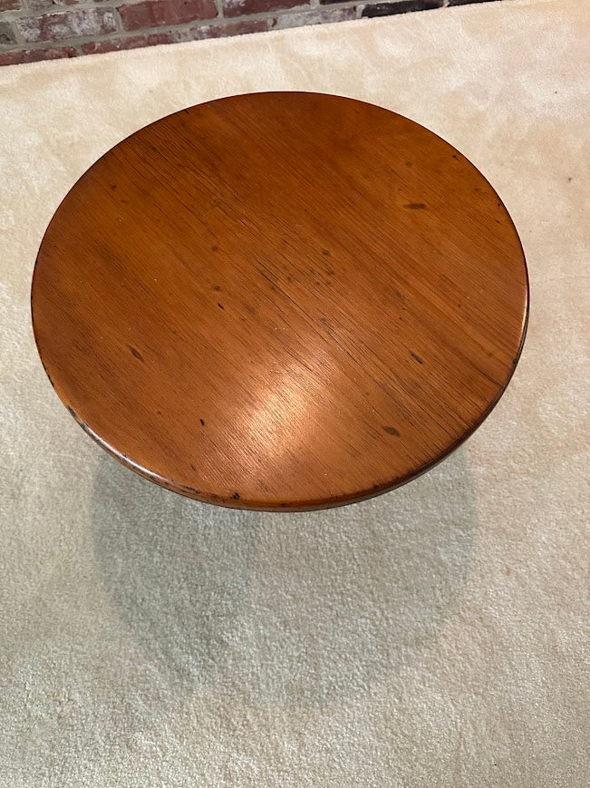 Beautifully made from solid wood, this petite table features a rounded top with a beveled edge, supported by a turned pedestal base and four gracefully curved legs. The natural aged finish reveals a rich honey tone and subtle wear that only time can create — adding warmth and authenticity to its look.