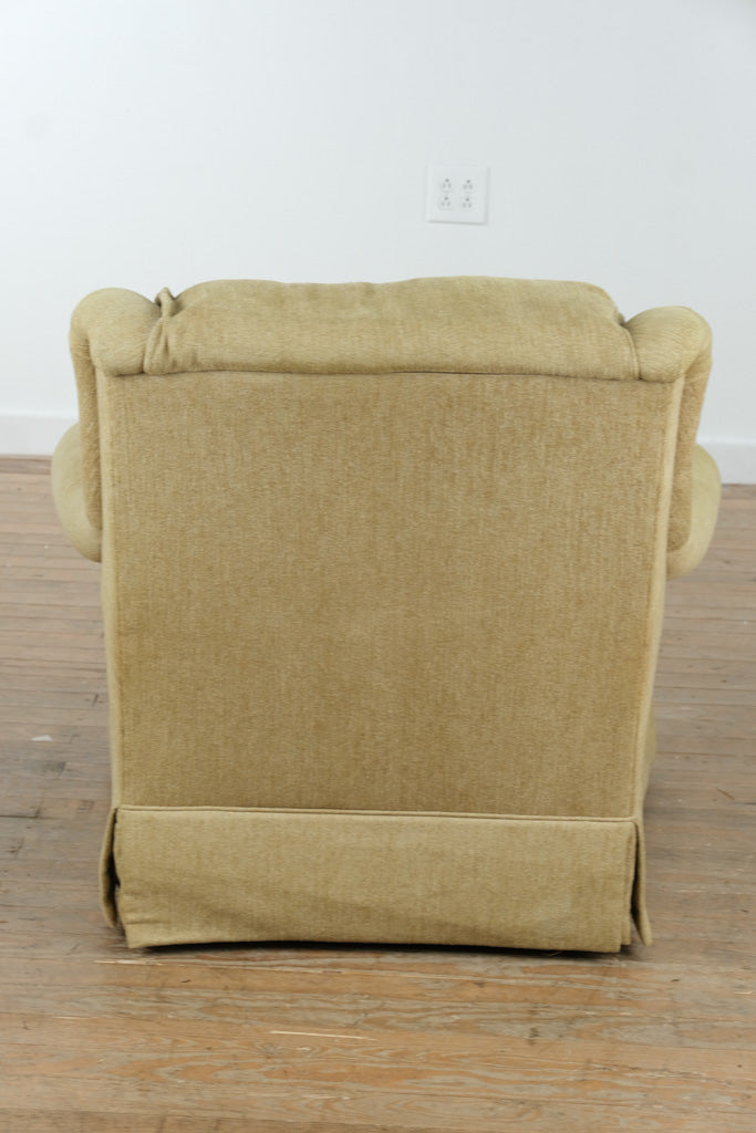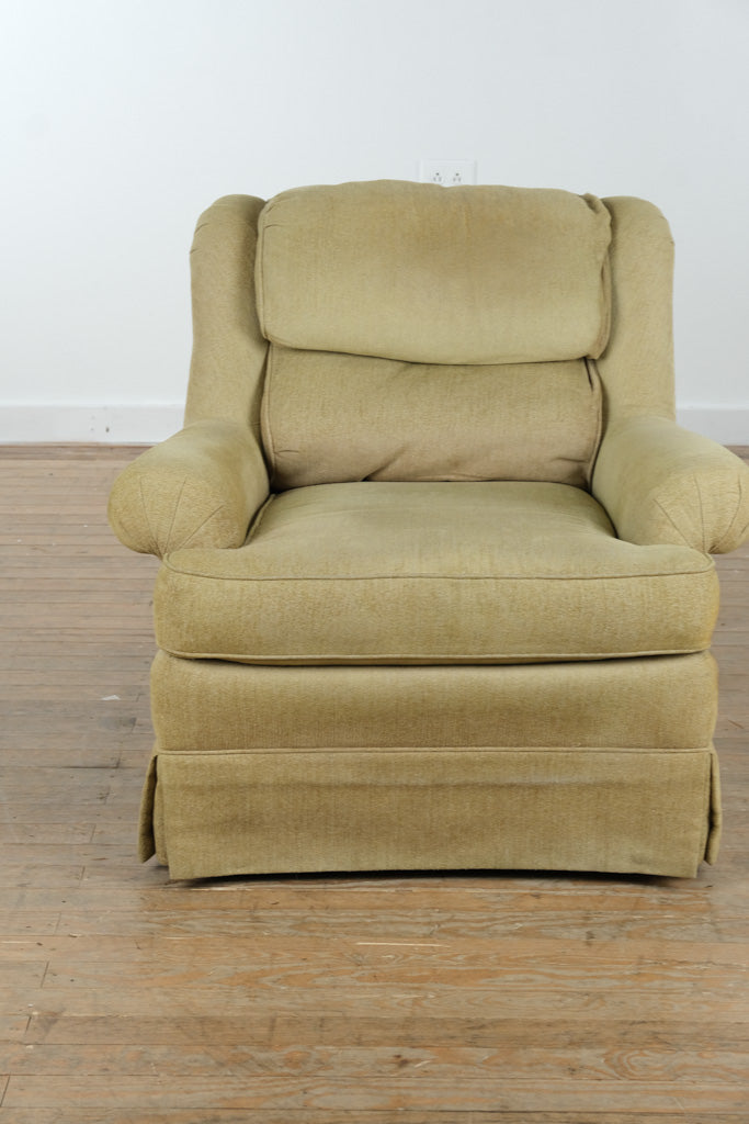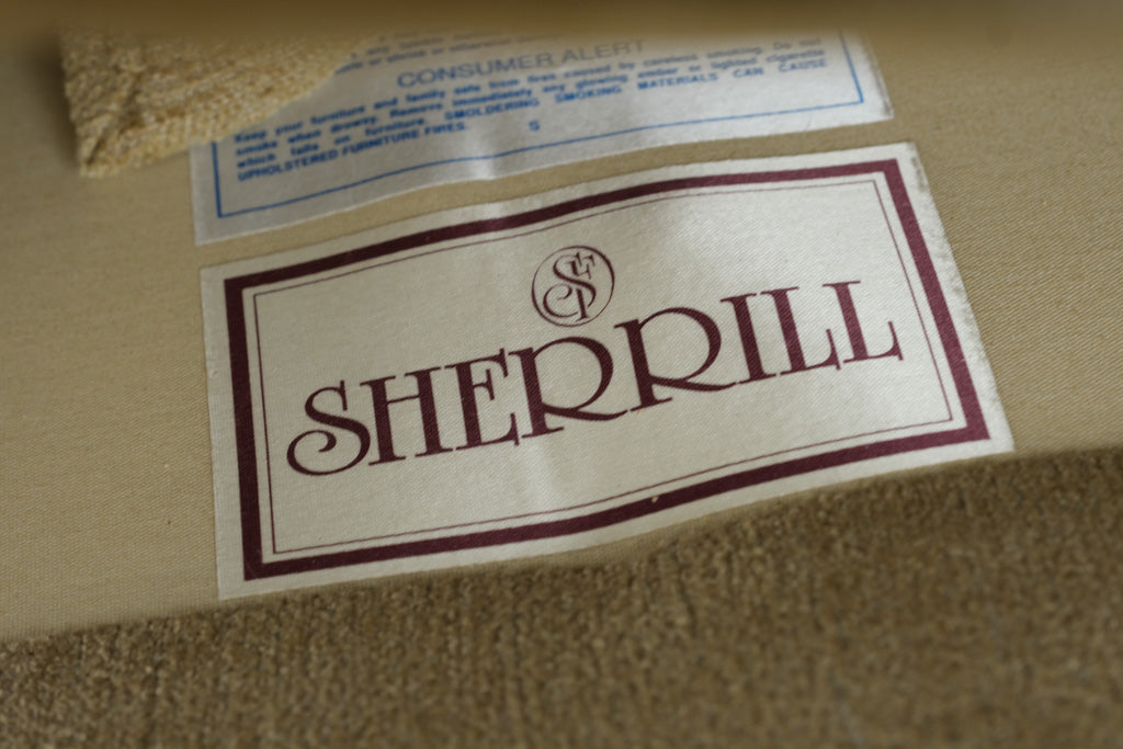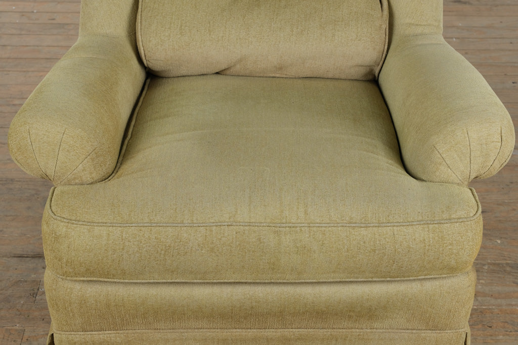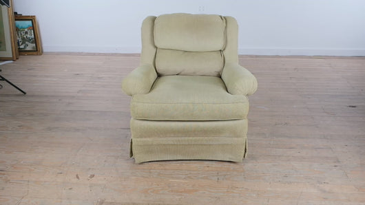 Crafted by Sherrill Furniture, a brand celebrated for its fine tailoring and traditional upholstery techniques, this chair features soft, rounded arms, a supportive back cushion, and a full tailored skirt that conceals its swivel and rocking base. Its neutral, textured upholstery makes it versatile enough for both classic and transitional interiors.