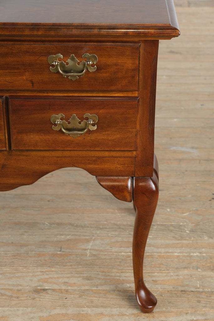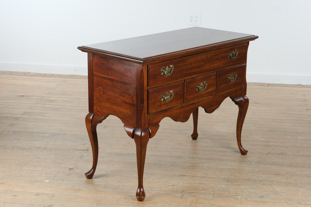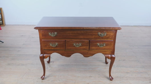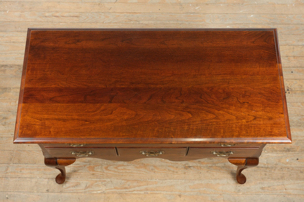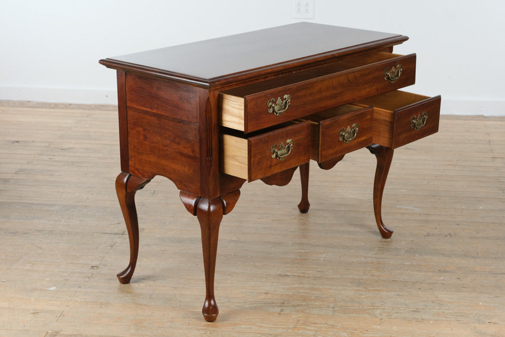 This beautifully crafted solid cherry console table features timeless Queen Anne styling with cabriole legs, scalloped apron, and traditional brass drawer pulls. The piece includes three dovetailed drawers that glide smoothly, offering practical storage while showcasing high-quality craftsmanship.
