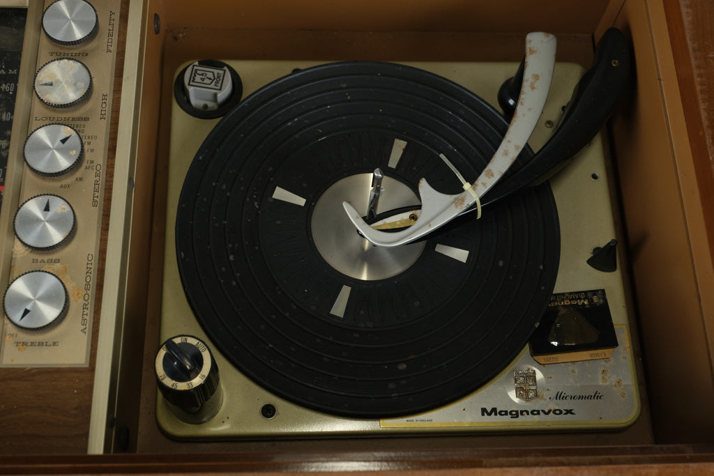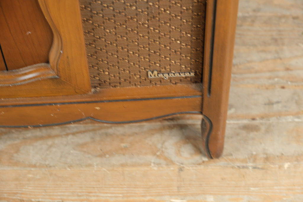 Bring back the charm of mid-century entertainment with this 1964 Magnavox Astro-Sonic stereo cabinet. Styled with French Provincial details, it features elegant curves, woven speaker panels, and brass hardware. The top slides open to reveal the original turntable and stereo controls, including bass, treble, loudness, and tuning dials.