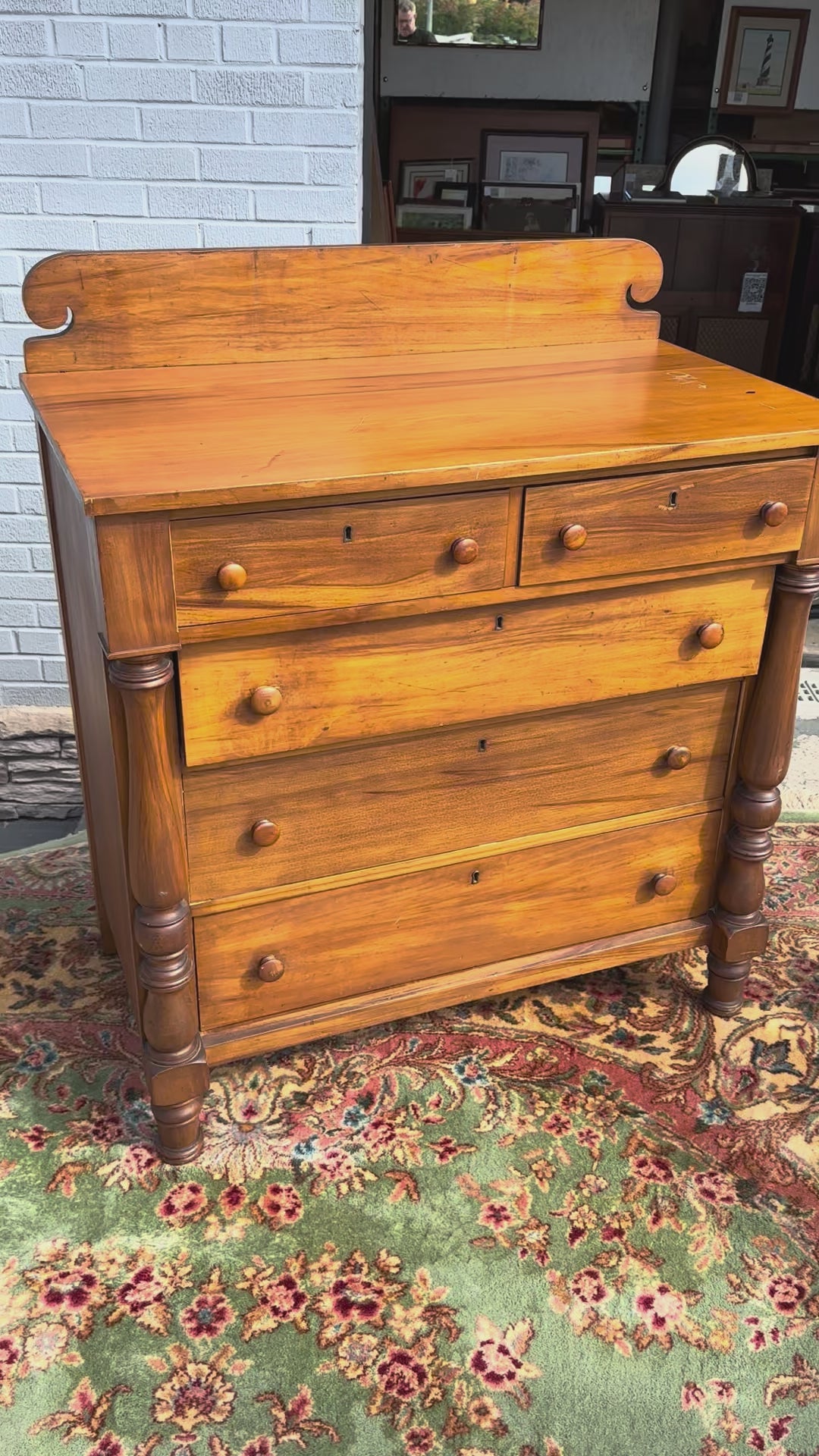 Constructed entirely of solid wood, this chest showcases hand-finished surfaces and sturdy dovetail joinery. The turned front columns and rounded drawer pulls echo traditional Empire design, emphasizing strength and symmetry. Though not an antique of the early 1800s, the piece retains the integrity and aesthetic charm of that era, offering heirloom-level quality with lasting durability.