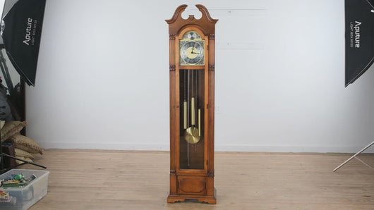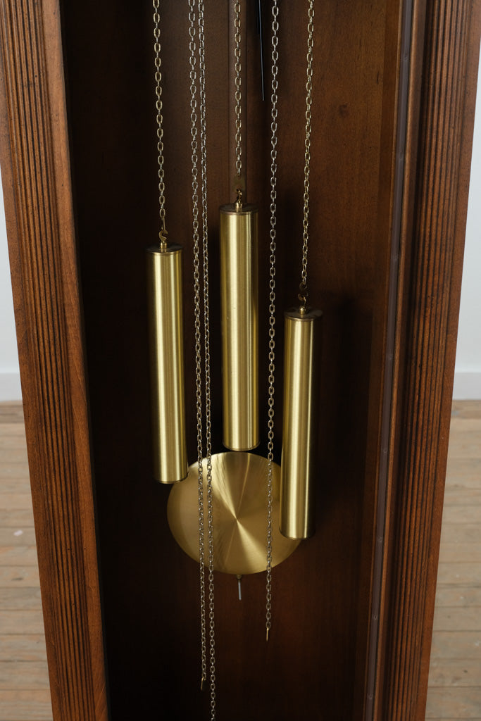 With its refined silhouette and stately presence, this grandmother clock brings warmth and character to any home interior. Ideal for a hallway, dining room, or living space, it serves as both a functional timepiece and a decorative focal point — a true reflection of late 20th-century American clockmaking tradition.
