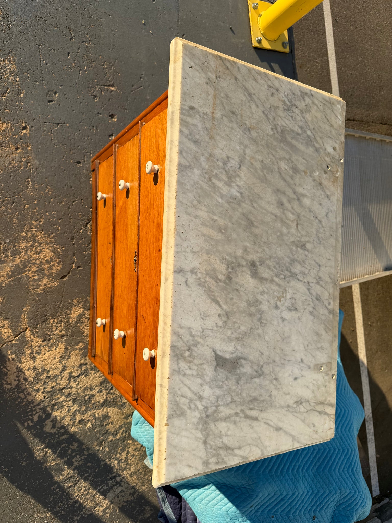 This versatile antique piece functions beautifully as a hall chest, nightstand, or bathroom vanity base. The marble surface adds both charm and durability, making it equally suited to traditional or farmhouse-inspired interiors.