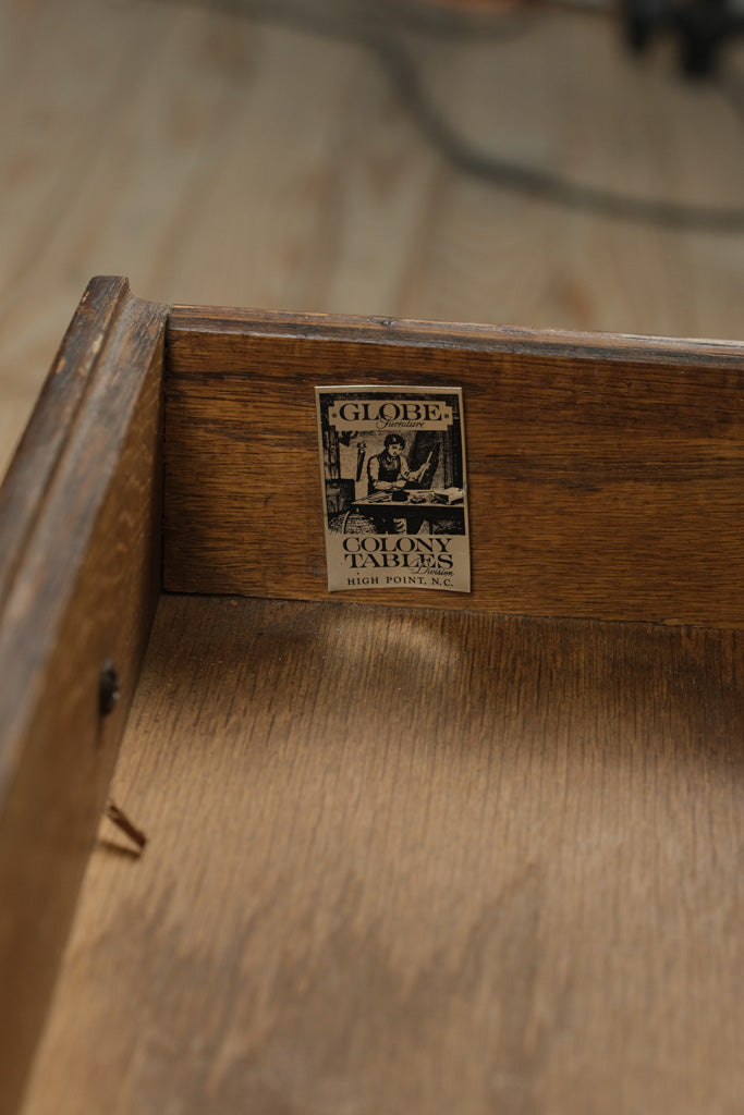 Constructed entirely from solid oak, this table highlights Globe’s hallmark durability and honest craftsmanship. The design features paneled construction on the top, turned legs, and simple brass drawer pulls that nod to its early 20th-century heritage. Its enduring structure and materials ensure it remains a worthy candidate for restoration or continued use with its naturally distressed finish.