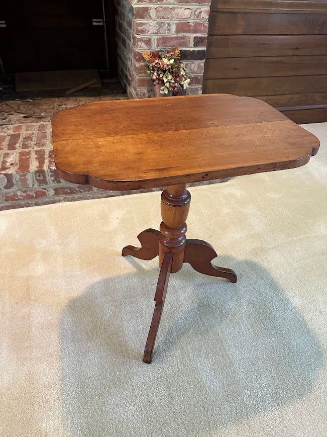 Charming and unique, this Antique Rectangular Flip-Top Side Table offers a rare variation on the classic tilt-top design. Crafted from warm-toned solid wood, this petite pedestal table features a rectangular top with softly rounded corners and a beautifully turned center column resting on elegant tripod legs.
