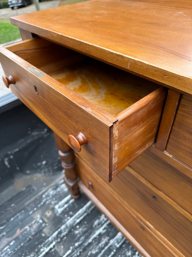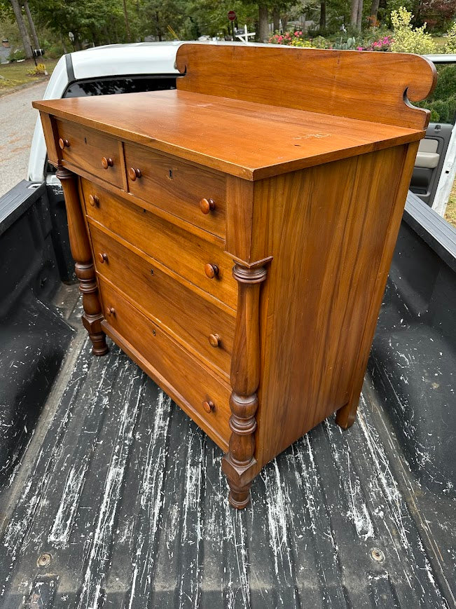 Constructed entirely of solid wood, this chest showcases hand-finished surfaces and sturdy dovetail joinery. The turned front columns and rounded drawer pulls echo traditional Empire design, emphasizing strength and symmetry. Though not an antique of the early 1800s, the piece retains the integrity and aesthetic charm of that era, offering heirloom-level quality with lasting durability.