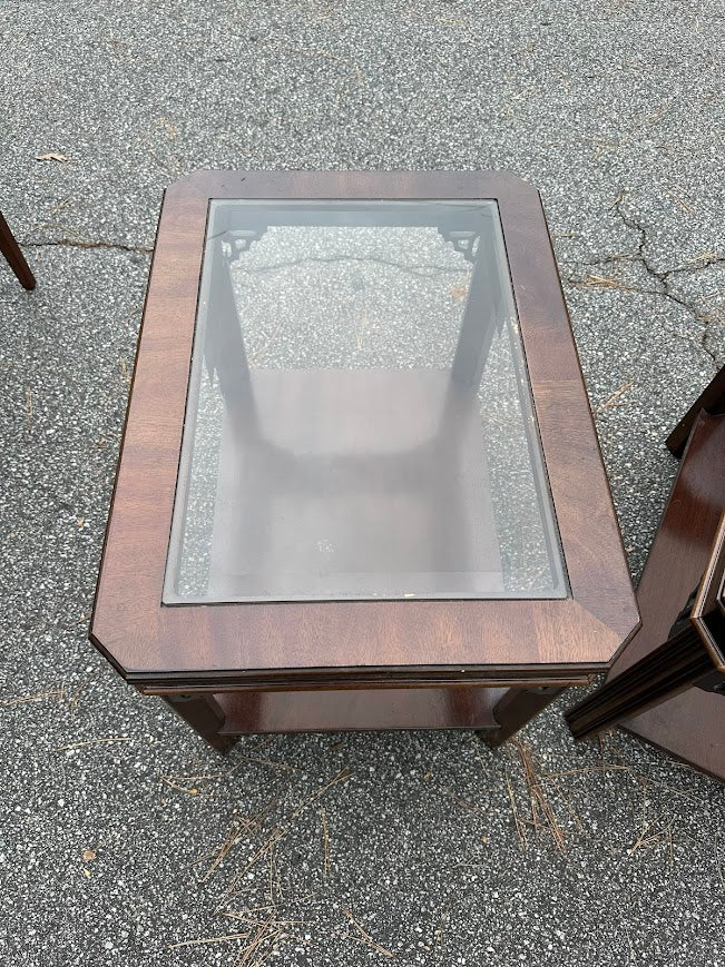 Crafted by Lane Furniture of Altavista, Virginia, these tables feature solid hardwood frames and inset glass tops for a polished, architectural look. The fretwork corner brackets and clean, angular lines reflect the Chippendale influence while remaining versatile for modern living spaces. Lane’s reputation for quality is evident in the precise joinery, weighty feel, and smooth surfaces of each piece.