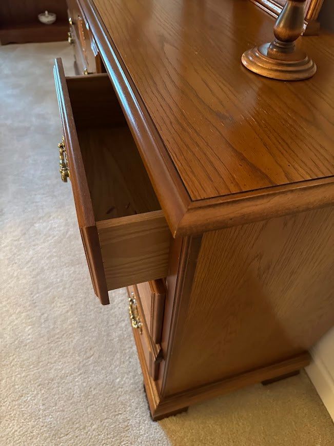 With its rich oak finish and graceful silhouette, this classic dresser and mirror set brings timeless sophistication to any bedroom. The scalloped mirror crown and carved shell motif add a touch of traditional charm, while the warm wood grain highlights the quality craftsmanship and enduring beauty of this piece.