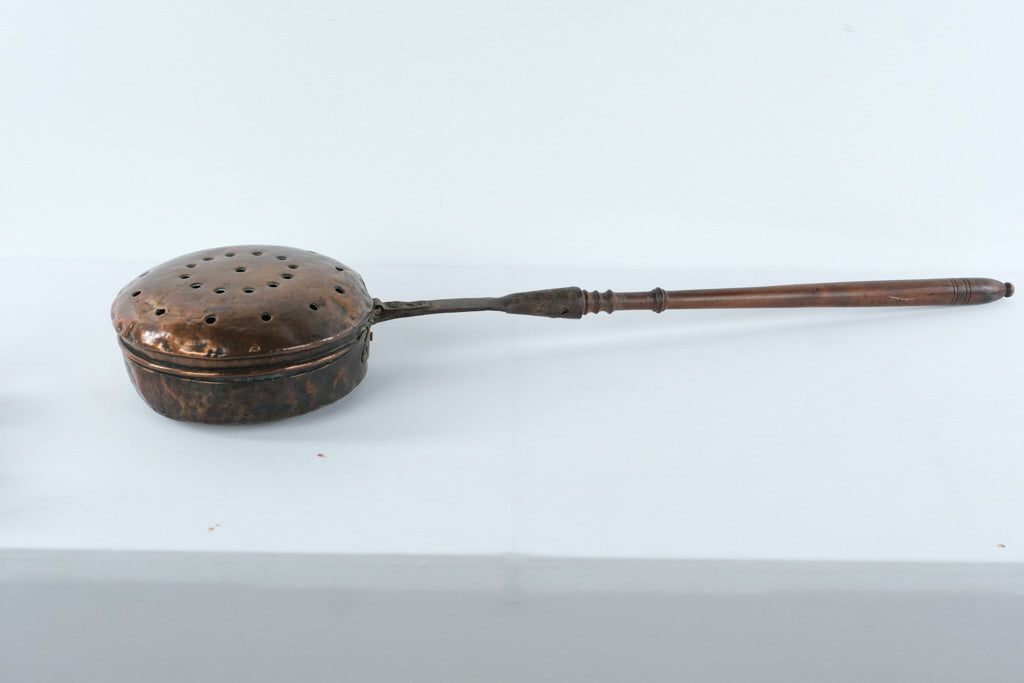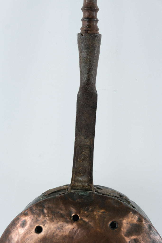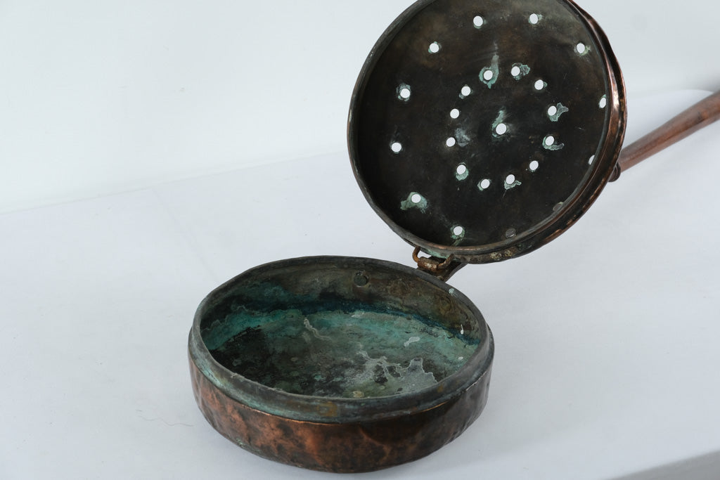 The generously sized copper pan features hand-punched ventilation holes and a hinged lid, allowing heated coals to safely radiate warmth. Its long turned wooden handle—designed to keep hands safely away from heat—adds both elegance and practicality. Today, it stands as a highly collectible decorative object, perfect for historic interiors, hearth displays, or antique tool collections.
