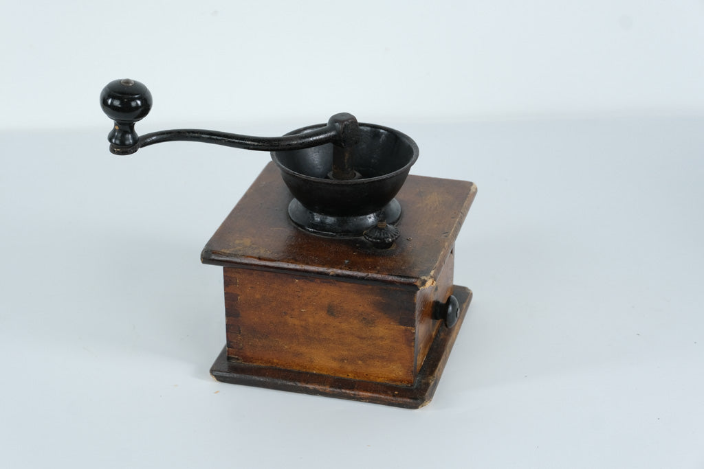 This charming antique coffee grinder showcases the classic craftsmanship of early 20th-century kitchenware. Made with a solid wood box base featuring traditional dovetail joinery and topped with a cast iron grinding mechanism, it captures the rustic, everyday beauty of old-world home life.