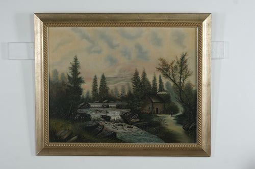 Vintage Oil on Canvas – Rustic Cabin by Waterfall in Forest Landscape – 34" × 28" Framed