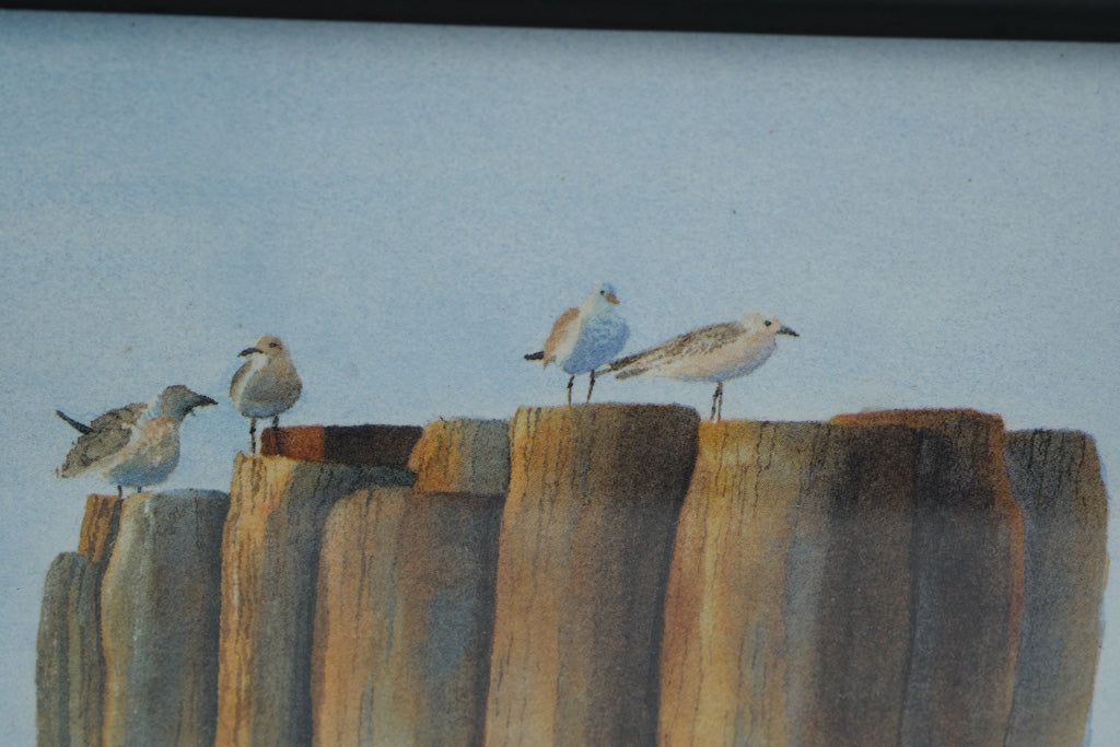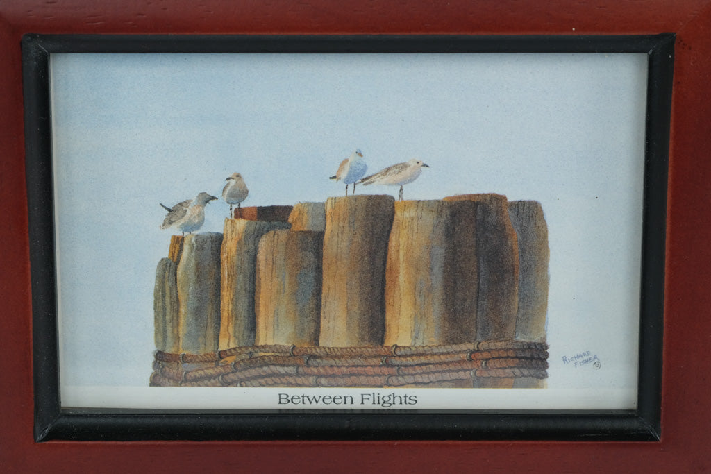 Capture a quiet moment by the sea with “Between Flights,” a charming framed print by artist Richard Fisher. The artwork shows seabirds resting on weathered pilings, evoking the calm and beauty of coastal life.