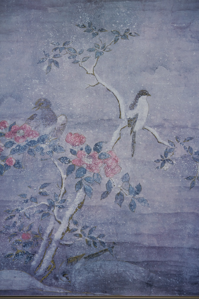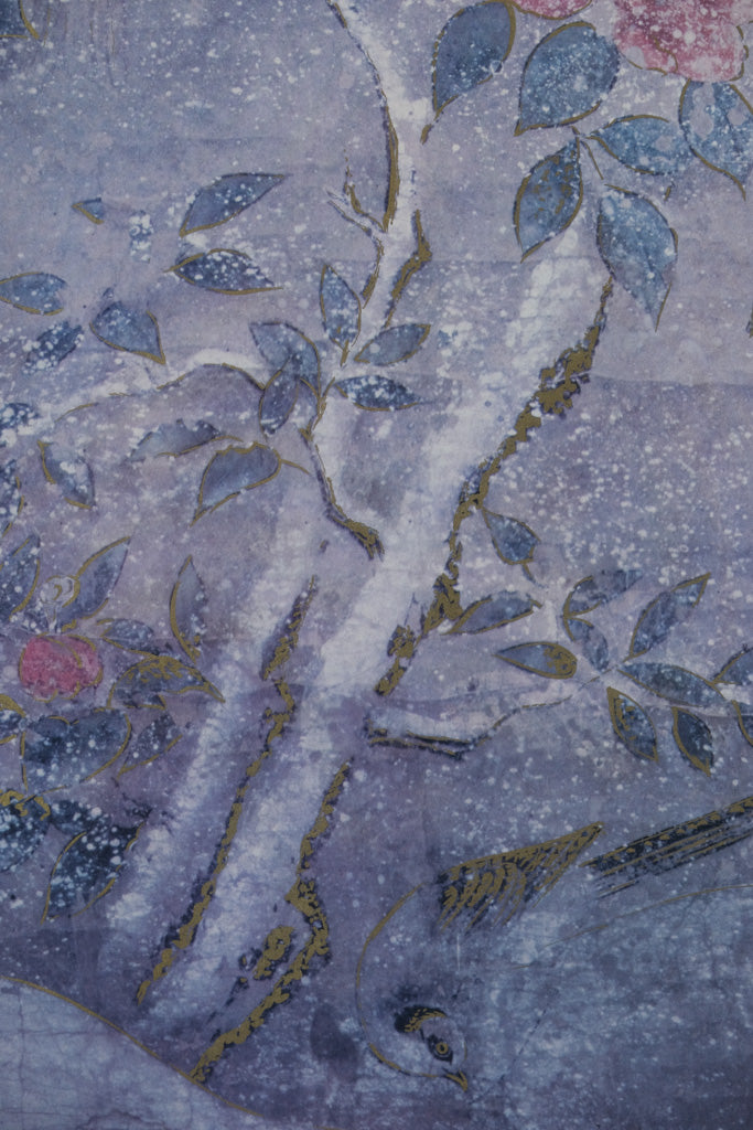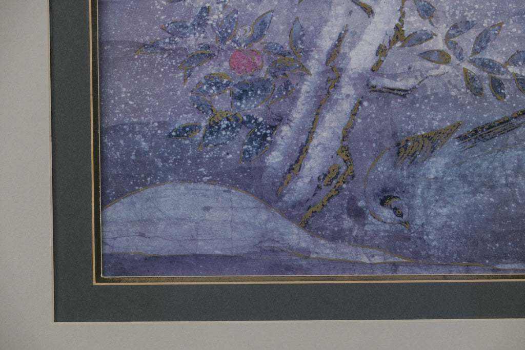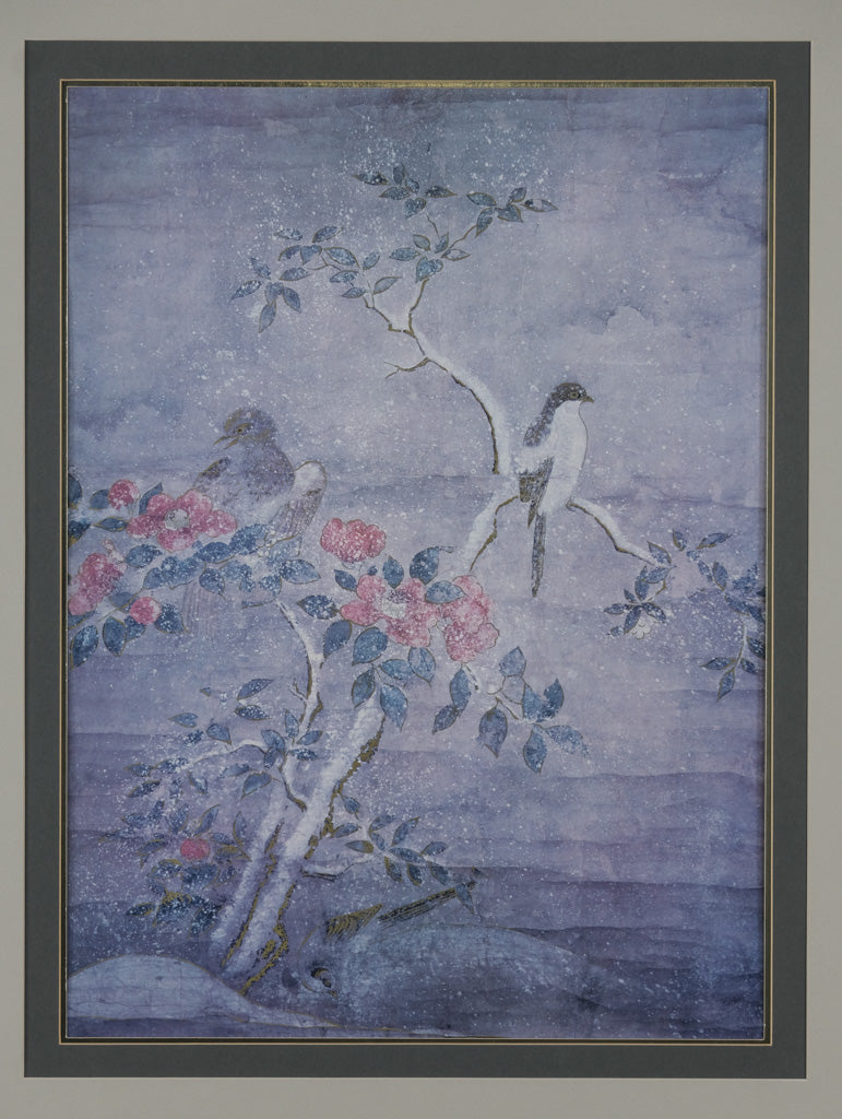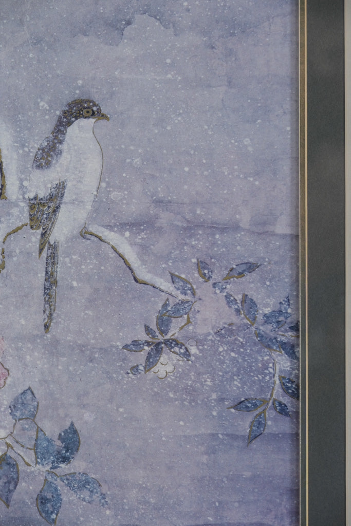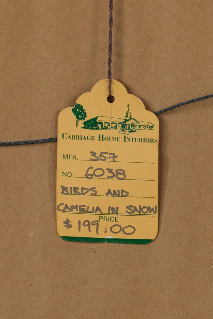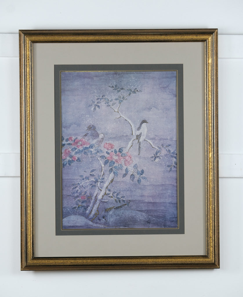 Infused with quiet beauty and serene winter charm, “Birds and Camellia in Snow” captures a poetic moment in nature. Two graceful birds rest among blossoming camellias dusted with soft snow, their delicate forms brought to life with subtle metallic gold highlights that shimmer under the light. The cool lavender and slate tones lend the composition a tranquil, ethereal feel — perfect for creating a calming atmosphere in any room. Professionally framed by Carriage House Interiors, the artwork features elegant double matting in neutral tones and a gently antiqued gold frame that enhances its timeless appeal.