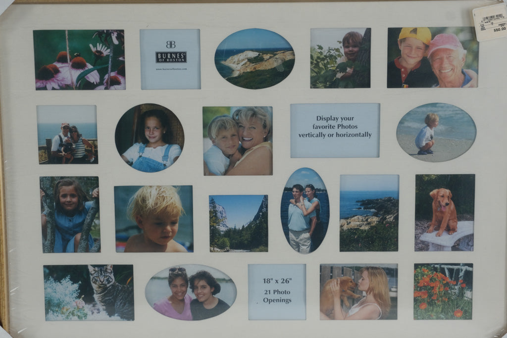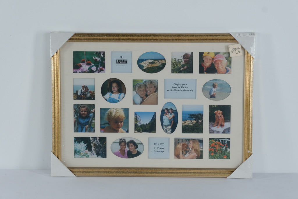 This generously sized multi-opening collage frame by Burnes of Boston is designed to showcase a lifetime of memories in one cohesive display. Featuring a classic gold-finished molding and a clean neutral mat, the frame holds 21 photos in a mix of rectangular and oval openings, allowing for both vertical and horizontal arrangements.