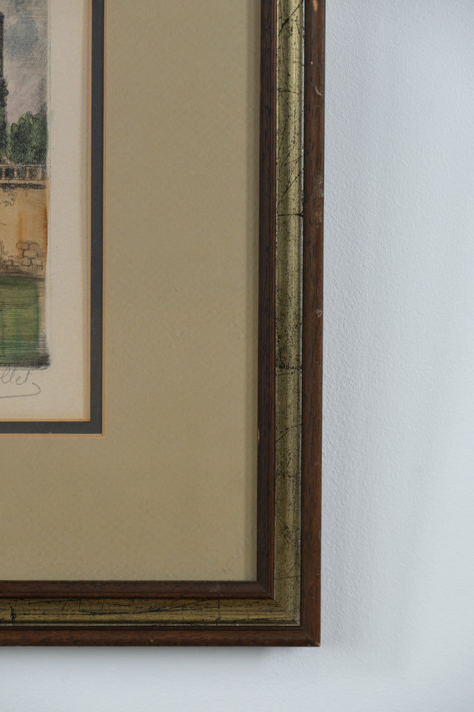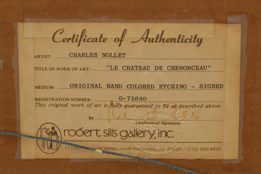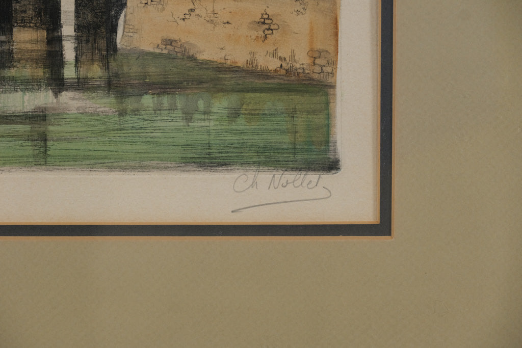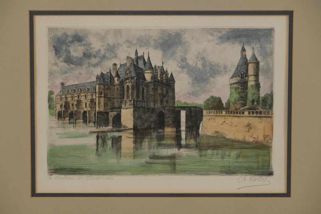 A timeless depiction of French Renaissance splendor, this original hand-colored etching by Charles Nollet captures the elegance of Le Château de Chenonceau, one of France’s most iconic Loire Valley castles. The piece showcases Nollet’s delicate linework and refined use of color, emphasizing the château’s arches mirrored in tranquil river waters beneath a moody sky. The artist’s skill in blending architectural precision with painterly atmosphere makes this etching a striking celebration of French heritage and beauty.