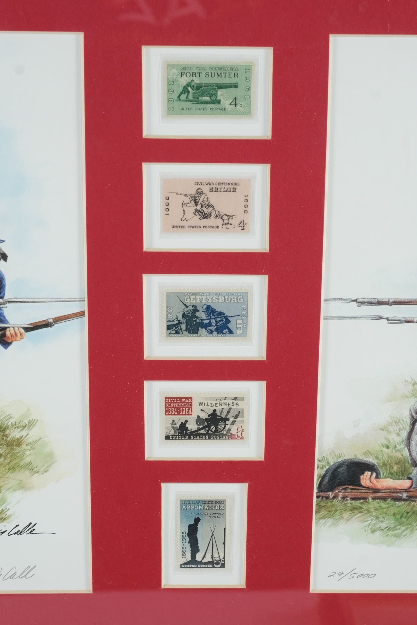 Between the two prints, a vertical display of five original U.S. postage stamps (1961–1965) celebrates key Civil War battles and anniversaries, including Fort Sumter, Shiloh, Gettysburg, The Wilderness, and Appomattox. Each stamp is carefully mounted within a deep red mat, enhancing the artwork’s patriotic tone and historical reverence.
