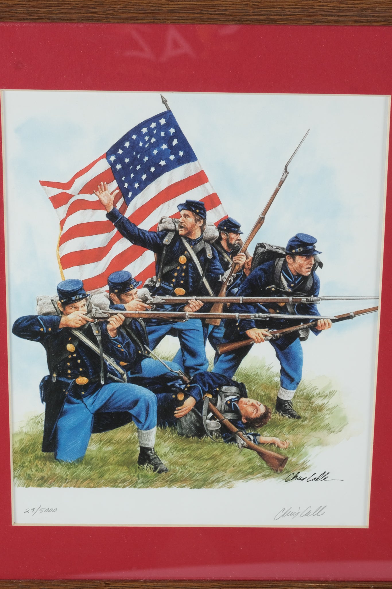 This striking Civil War Bicentennial Commemorative Framed Art Set by acclaimed illustrator Chris Calle captures the intensity and emotion of America’s most defining conflict. Featuring two signed limited-edition lithographs—one depicting Union troops rallying under the Stars and Stripes and the other showing Confederate soldiers defending their position—this dual composition offers a powerful side-by-side portrayal of both perspectives.