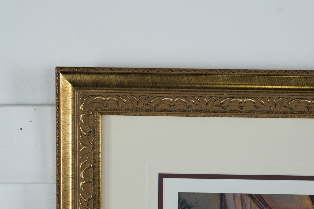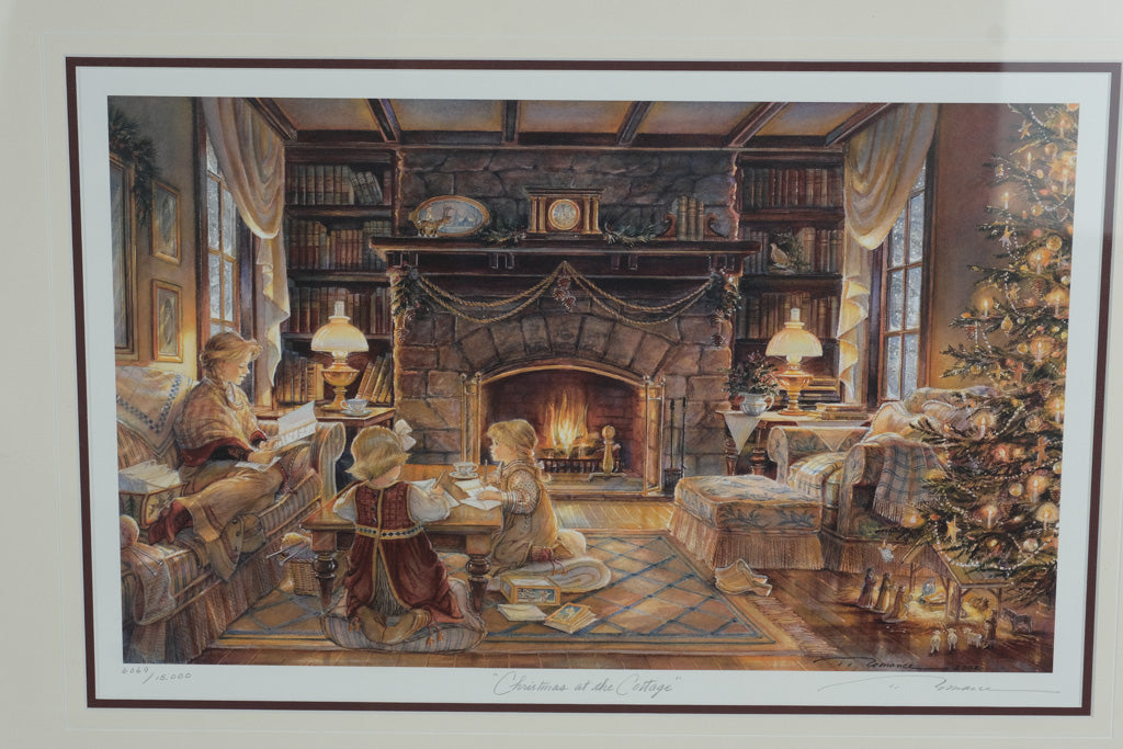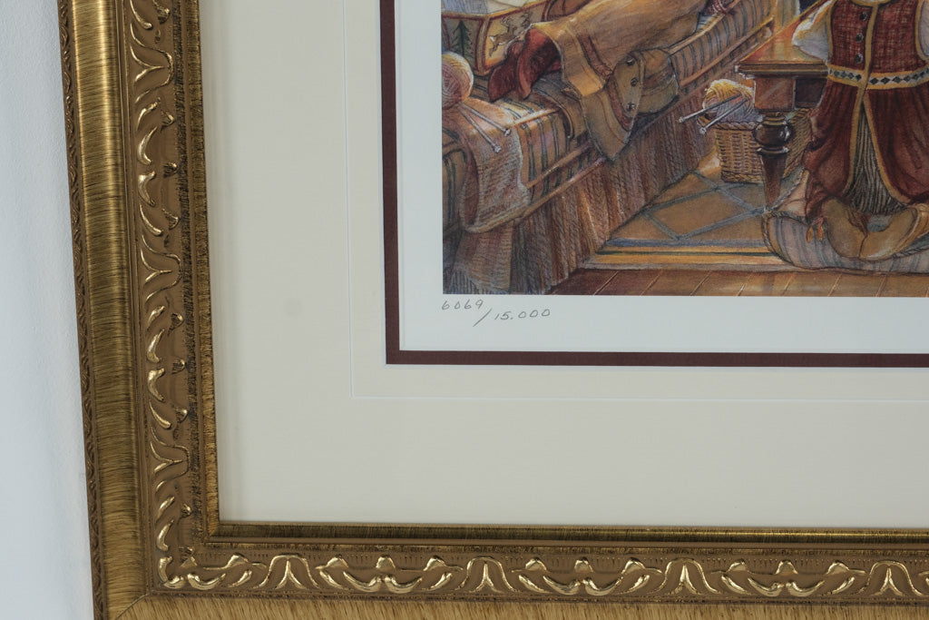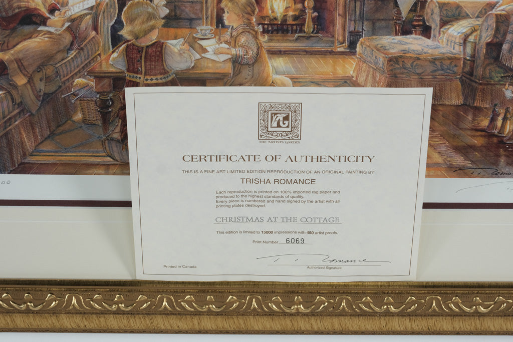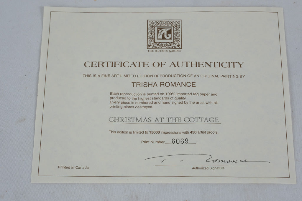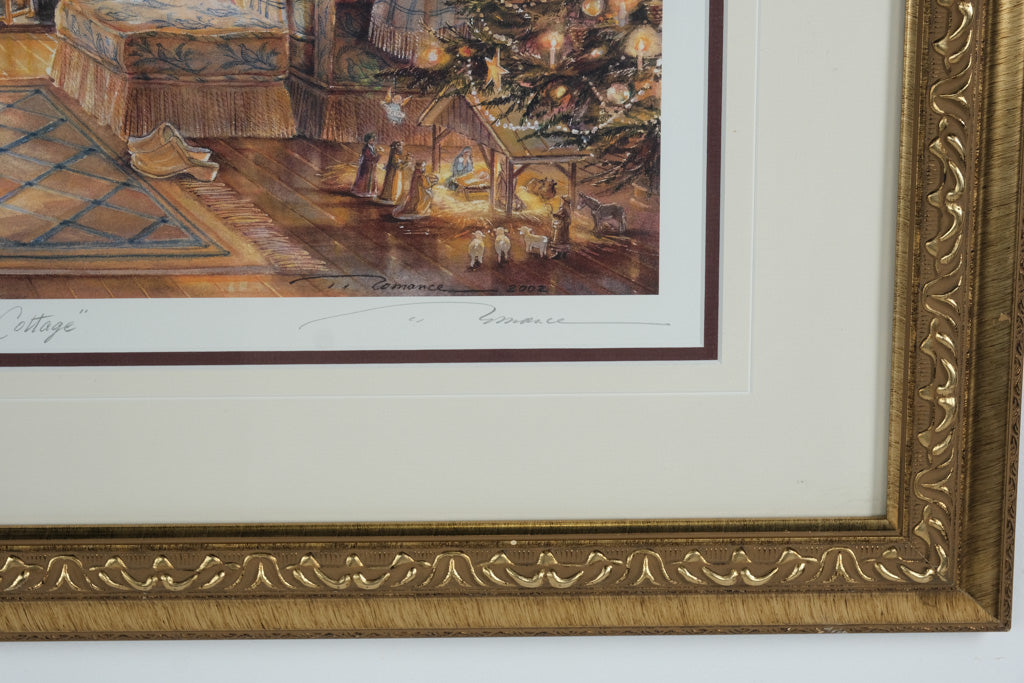 This fine art print is hand-signed and numbered (6069/15000) by Trisha Romance and includes the original Certificate of Authenticity from The Artist’s Garden. Elegantly presented in a gold-tone frame with double matting, this collectible artwork brings classic Christmas serenity to any home or art collection.