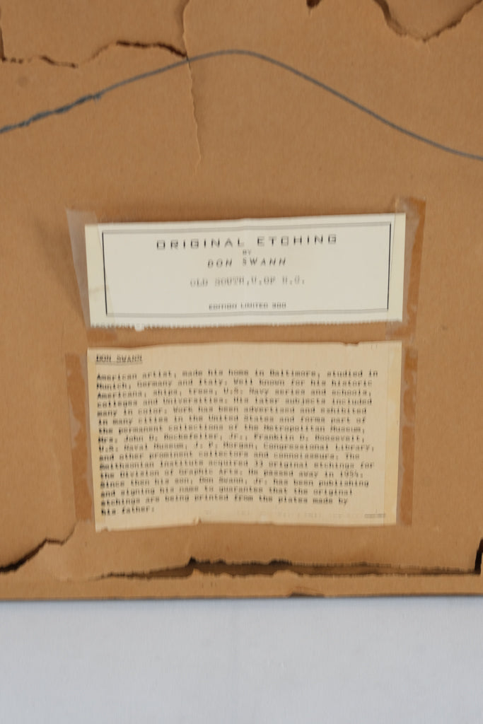 Swann, who lived in Baltimore and studied in Munich, Germany, and Italy, is well known for his etchings of historic American architecture and naval subjects. His works were exhibited at the Smithsonian, the U.S. Naval Academy, and the Library of Congress, among others. Each etching was hand-pulled from Swann’s original copper plates, and this example is part of a limited edition of 300 prints.