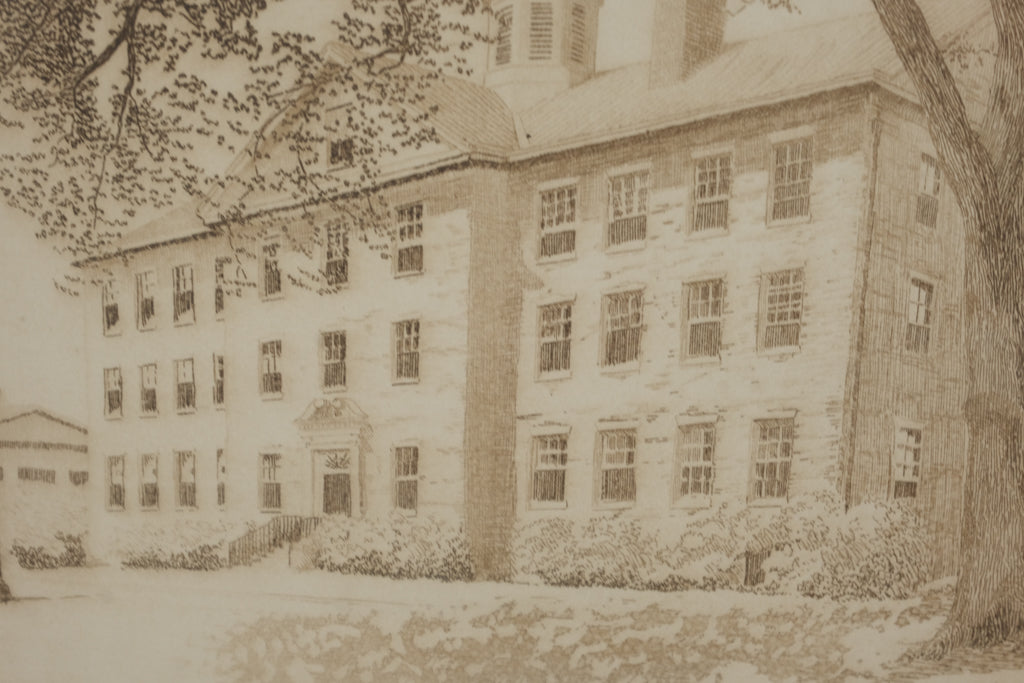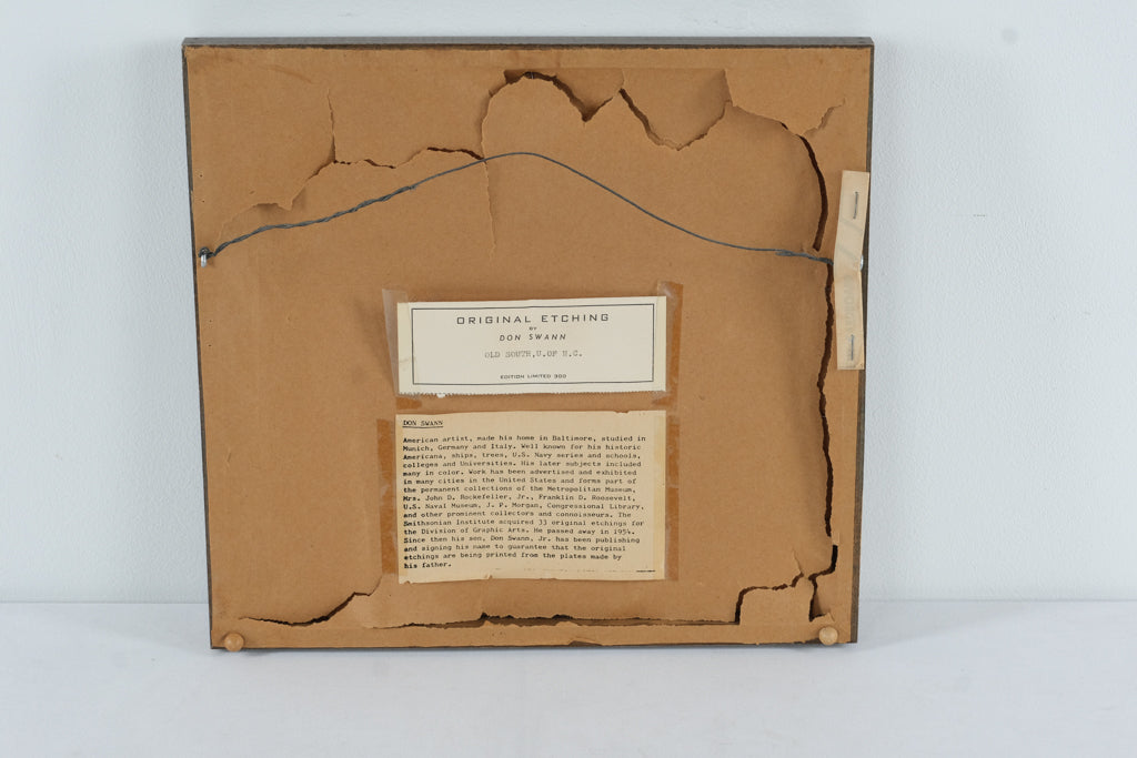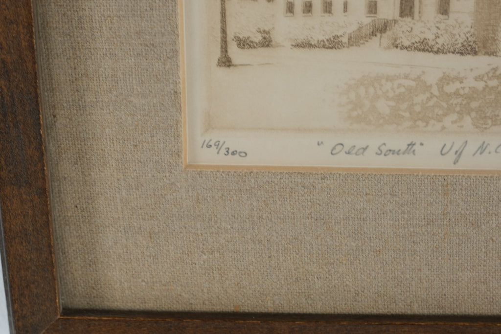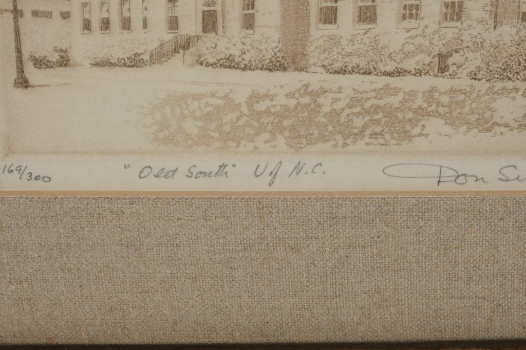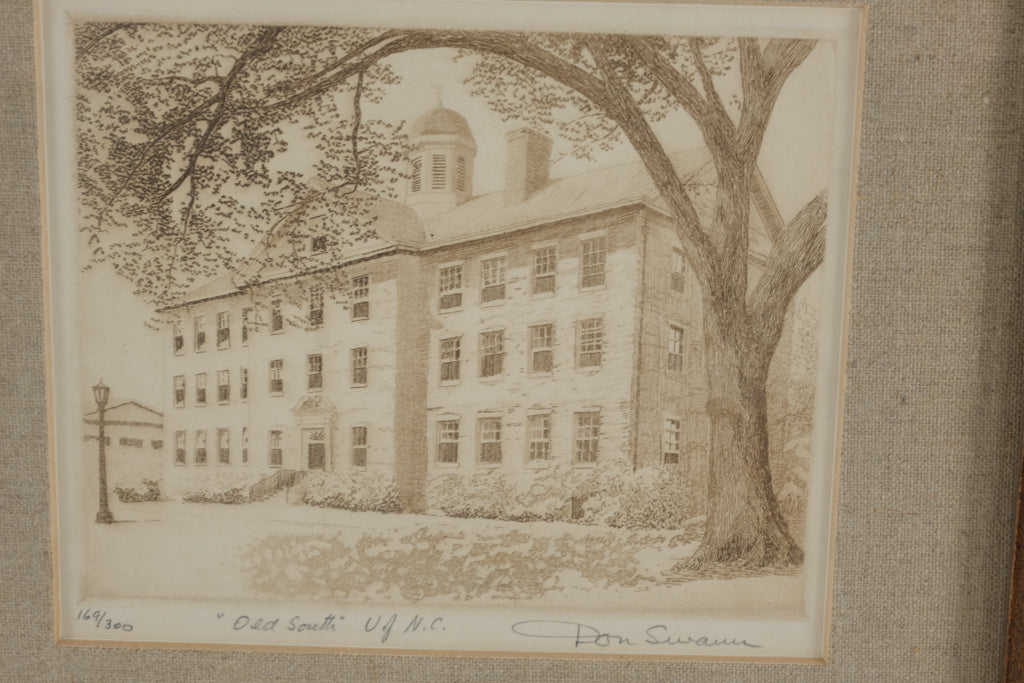 This vintage etching by noted American artist Don Swann depicts the historic “Old South Building” on the University of North Carolina campus. Rendered with Swann’s signature precision and warm tonal detail, the image captures the timeless Georgian architecture framed by mature trees.