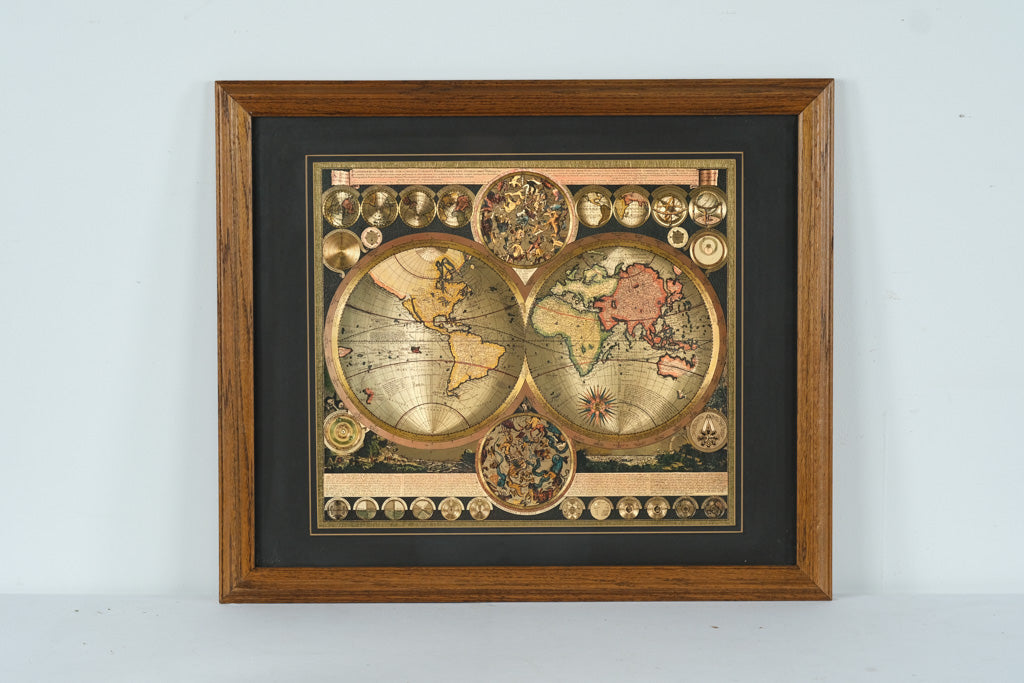 This framed vintage-style double hemisphere world map reproduction features richly detailed terrestrial and celestial imagery in the tradition of seventeenth and eighteenth century European cartography. Offered by Craze Furniture, the piece combines decorative astronomy, classical illustration, and geographic mapping into an elegant statement wall display suitable for office, study, or library décor.