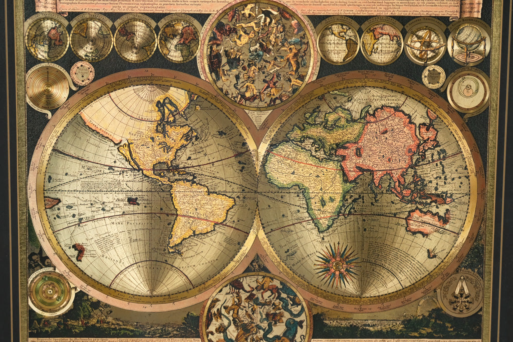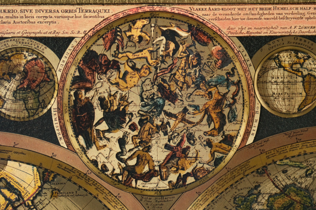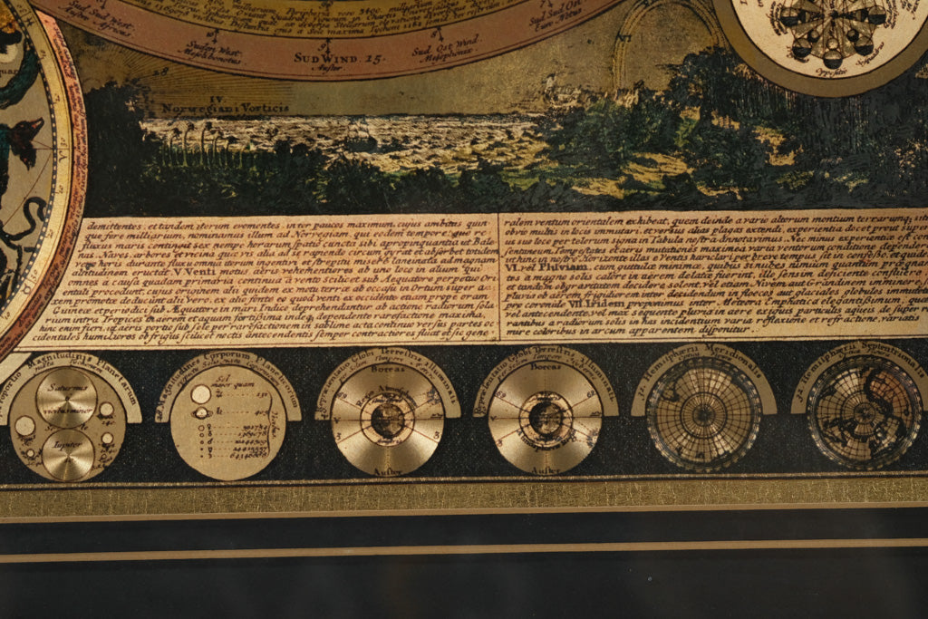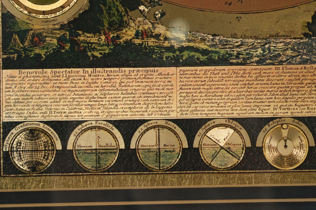 Surrounding the hemispheres are multiple decorative astronomical and scientific elements including: