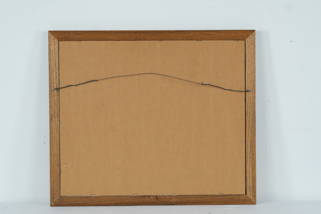 Print surface appears clean and vibrant with strong coloration. No visible tears or major staining. Minor light reflection visible in photos due to glass. Frame shows light surface wear consistent with age and handling. Backing intact with hanging wire present. Overall excellent decorative condition.