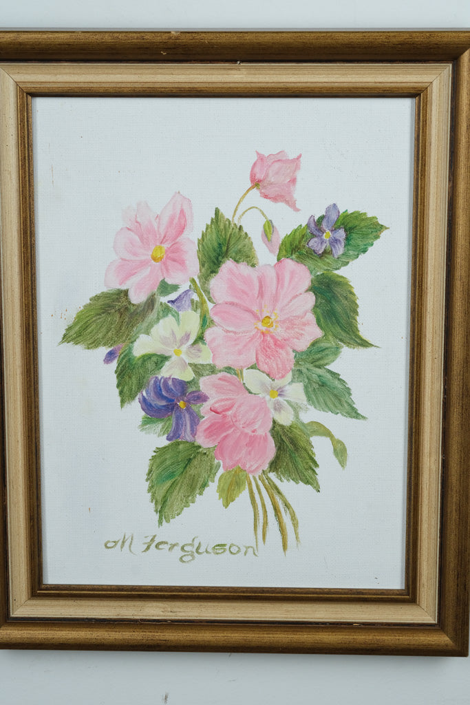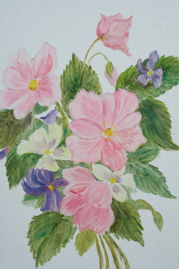 This charming original oil painting titled “Flowers on Board” was created by Maude Ferguson, a beloved North Carolina artist and charter member of the Sanford Brush and Palette Club. The composition features a delicate bouquet of pink hibiscus, white petunias, and purple violets, all rendered in soft, naturalistic detail against a white background.