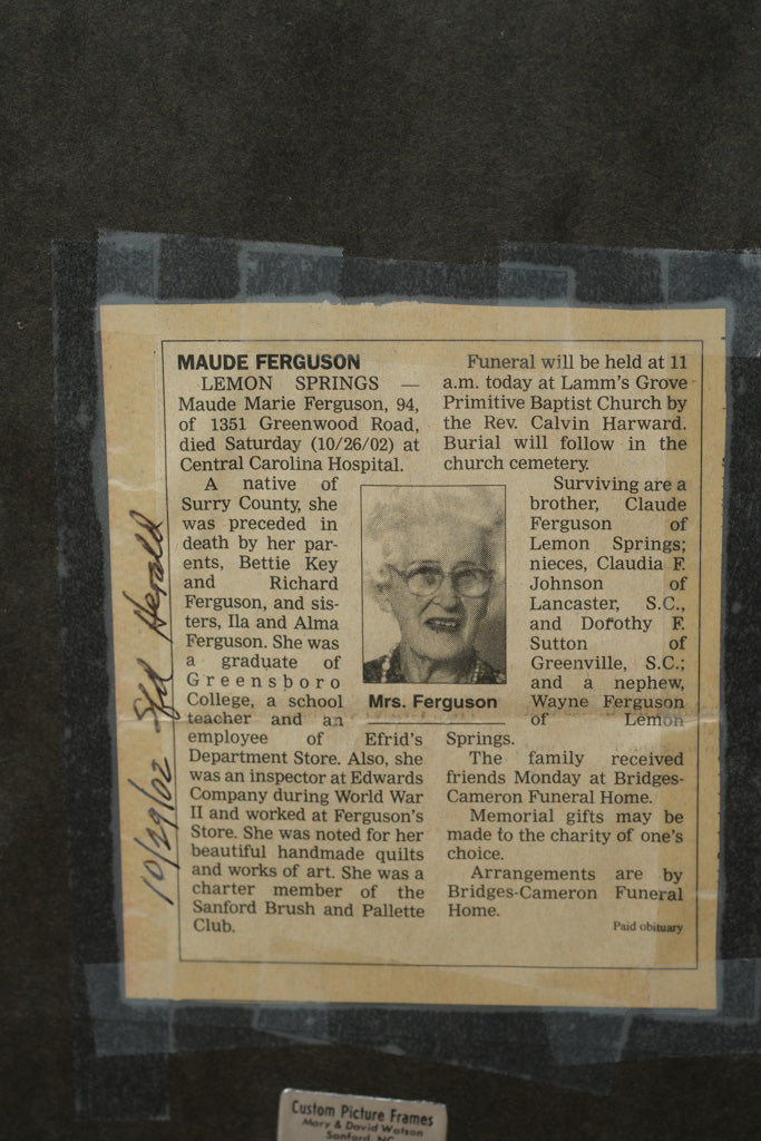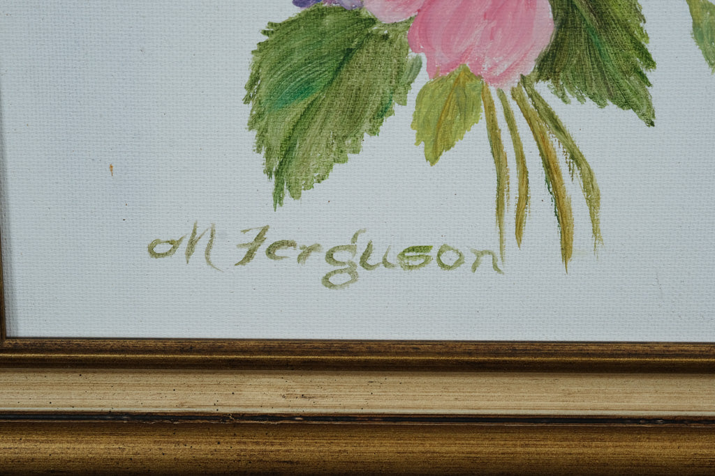 Maude Ferguson, who lived to be 94, was widely recognized for her floral compositions and contributions to the local arts community. This painting includes a copy of her obituary affixed to the back, offering a glimpse into the life of a passionate and dedicated artist.