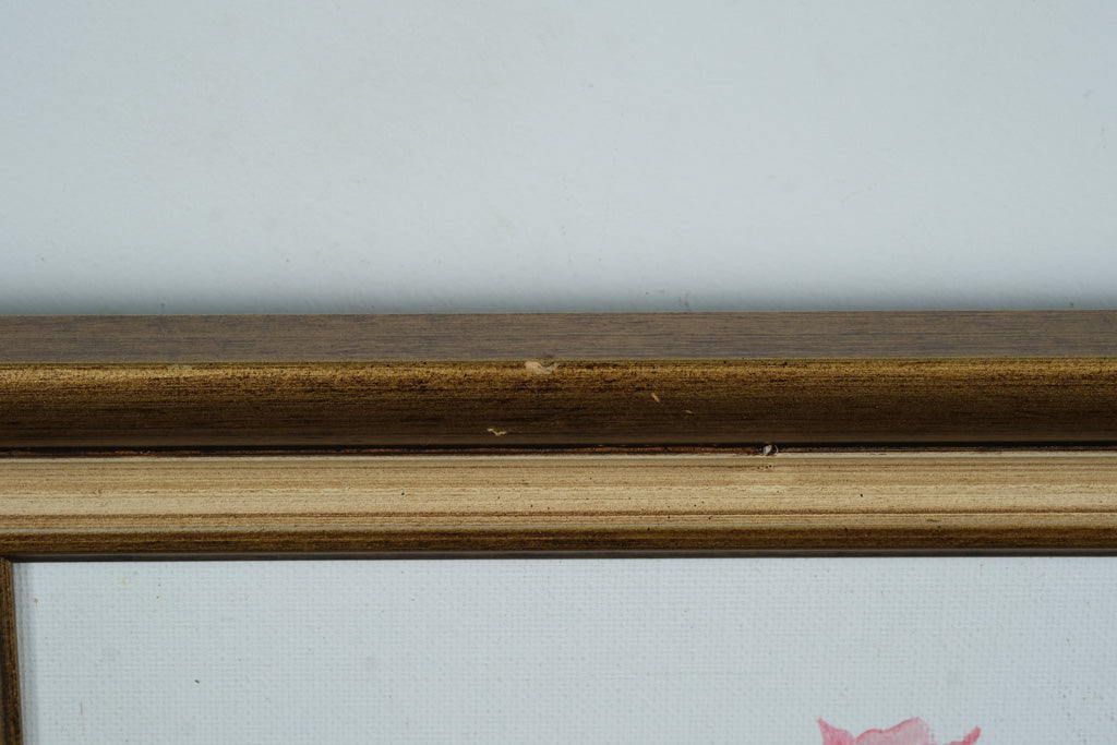 Signed at the bottom by the artist, this piece is beautifully framed in a double-layered wooden frame with a vintage patina that complements the artwork’s gentle tones.