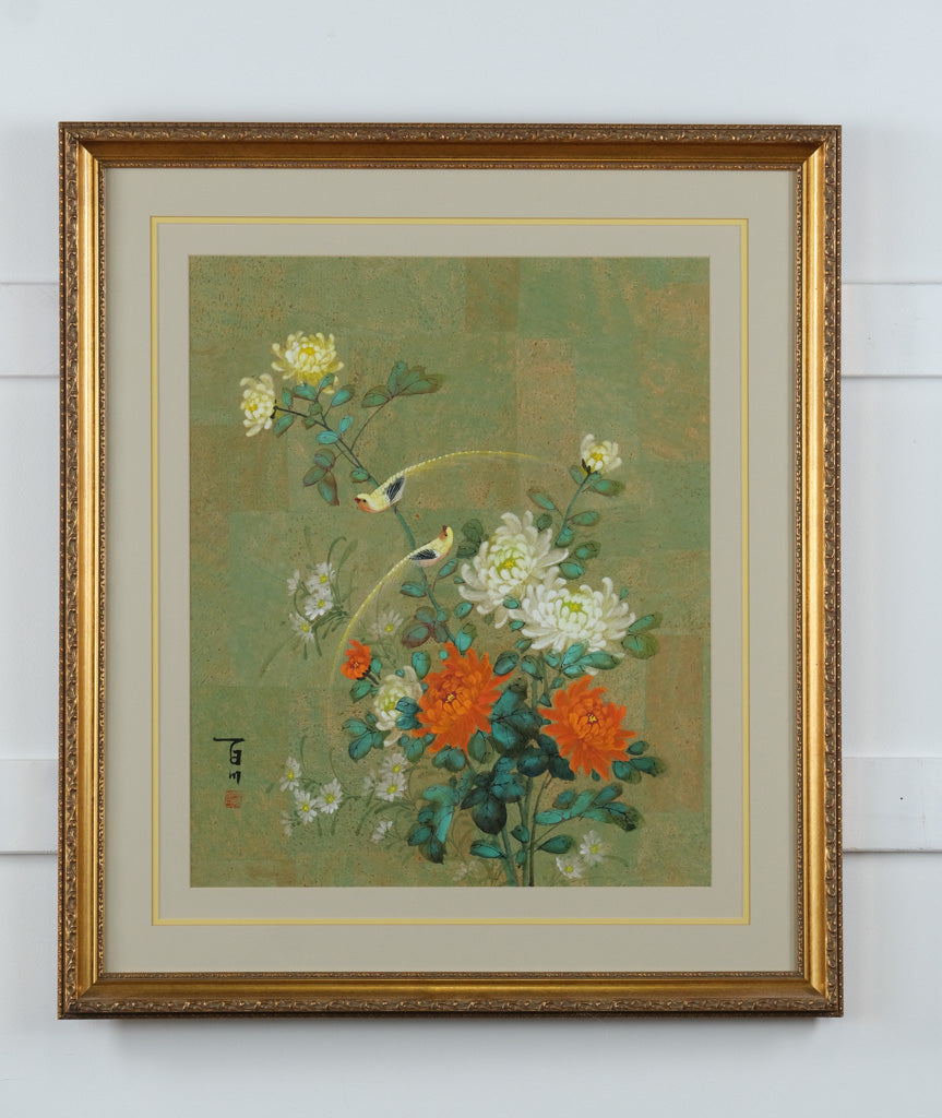 Original-style Asian botanical print featuring chrysanthemums and songbirds