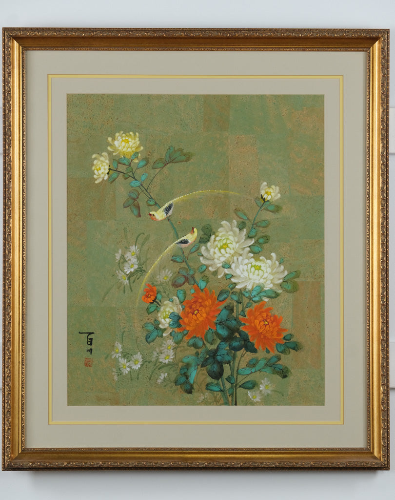 This elegant framed Asian art print beautifully captures the grace of nature with two delicate songbirds perched among blooming chrysanthemums. The piece features vivid tones of orange, cream, and jade green, set against a softly textured background that enhances its timeless appeal. The artist’s signature and red seal mark add authenticity and charm, while the detailed brushwork evokes the serenity of traditional East Asian botanical painting. Professionally matted in cream and gold and set in a refined gilt frame, this artwork brings tranquility and sophistication to any space — perfect for entryways, living rooms, or serene office settings.
