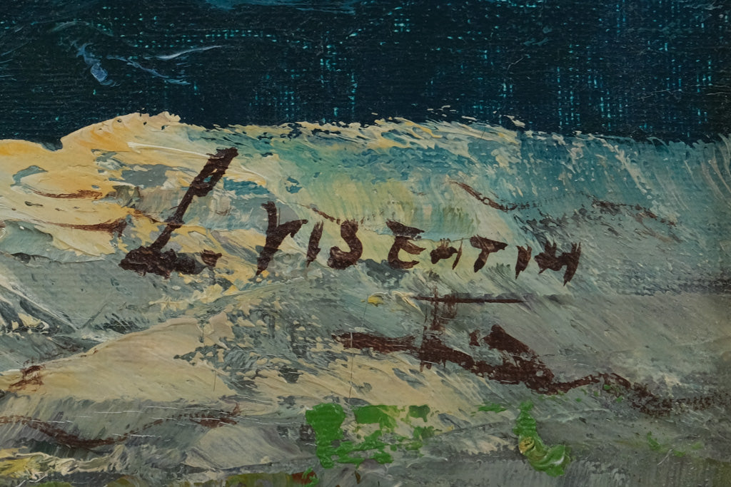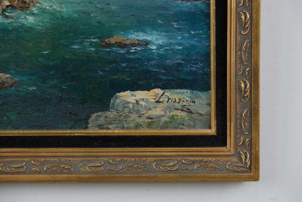 This striking original oil on canvas by L. Visentin captures the rugged beauty of a dramatic coastal landscape where land meets sea. The artist’s textured brushwork brings life to the churning turquoise waters, sheer limestone cliffs, and windswept greenery that characterize this breathtaking seascape. The sky is softly layered with coastal mist, lending depth and tranquility to the composition. Rich in color and motion, this piece evokes the raw natural beauty of the Mediterranean coastline.